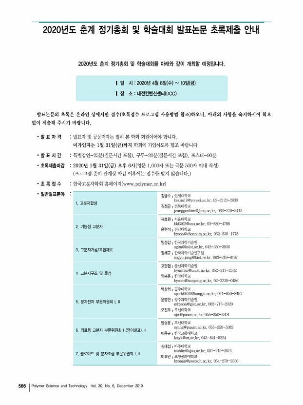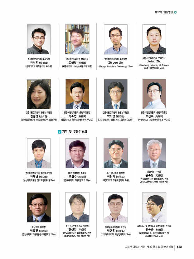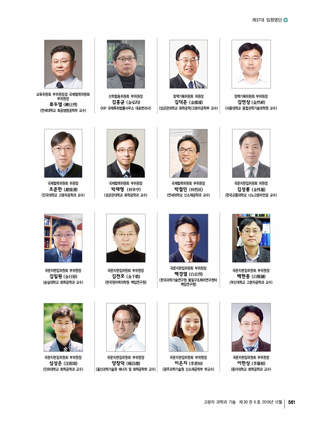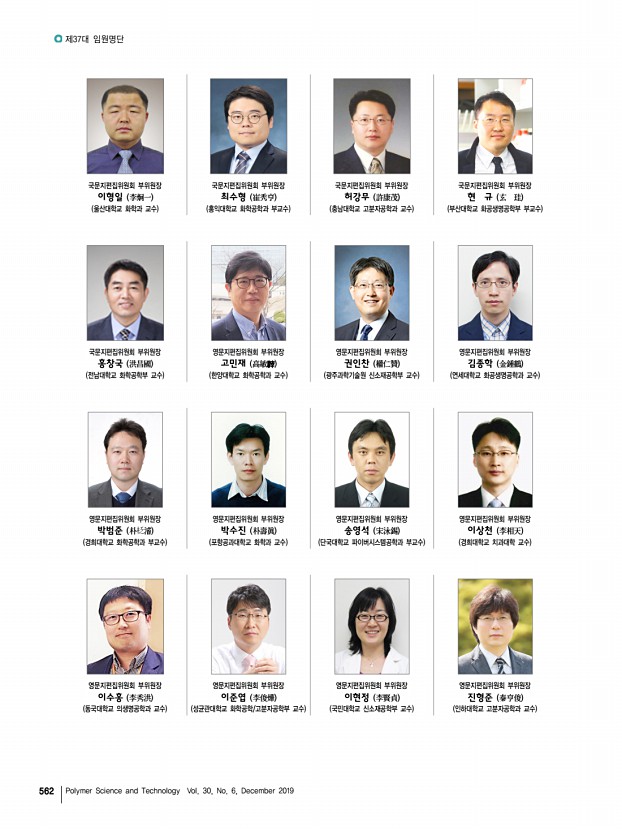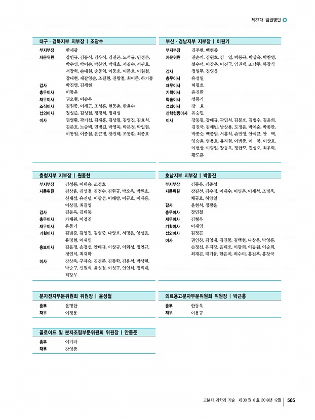 제37대 임원명단 고분자 과학과 기술 제 30 권 6 호 2019년 12월 565 대구ㆍ경북지부 지부장 | 조광수 부산ㆍ경남지부 지부장 | 이원기 부지부장 자문위원 감사 총무이사 재무이사 조직이사 섭외이사 이사 한세광 강인규, 김봉식, 김우식, 김진곤, 노석균, 민경은, 박수영, 박이순, 박찬언, 박태호, 서길수, 서관호, 서장혁, 손태원, 송동익, 이동호, 이문호, 이원철, 장태현, 제갈영순, 조길원, 진왕철, 최이준, 하기룡 박진영, 김세현 이동윤 권오형, 이승우 김원종, 이세근, 조성훈, 현동춘, 한윤수 정성준, 김성철, 정경혜, 정대성 권영환, 곽기섭, 김재홍, 김상필, 김영진, 김효석, 김준호, 노승백, 민병길, 박영욱, 박문정, 박일현, 이동원, 이종철, 윤근병, 장진해, 조동환, 최종호 부지부장 자문위원 감사 총무이사 재무이사 기획이사 학술이사 섭외이사 산학협동이...