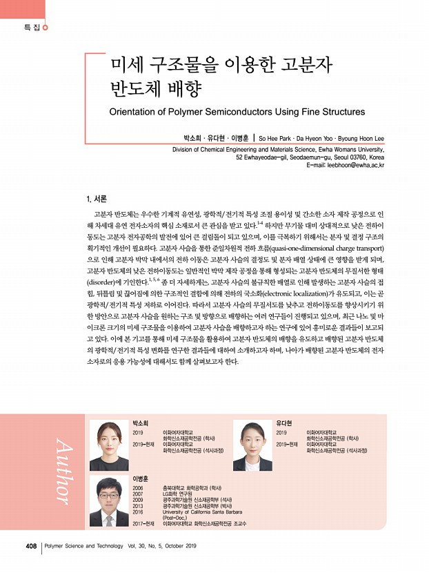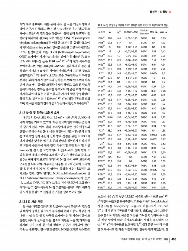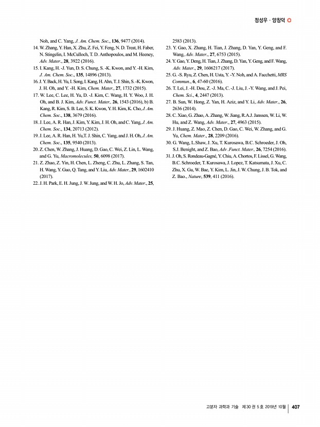 정성우ㆍ양창덕 고분자 과학과 기술 제 30 권 5 호 2019년 10월 407 Noh, and C. Yang, J. Am. Chem. Soc., 136, 9477 2014 14. W. Zhang, Y. Han, X. Zhu, Z. Fei, Y. Feng, N. D. Treat, H. Faber, N. Stingelin, I. McCulloch, T. D. Anthopoulos, and M. Heeney, Adv. Mater., 28, 3922 2016 15. I. Kang, H. -J. Yun, D. S. Chung, S. -K. Kwon, and Y. -H. Kim, J. Am. Chem. Soc., 135, 14896 2013 16. J. Y. Back, H. Yu, I. Song, I. Kang, H. Ahn, T. J. Shin, S. -K. Kwon, J. H. Oh, and Y. -H. Kim, Chem. Mater., 27, 1732 2015 17. W. Lee, C. Lee, H. Yu, D. -J. Kim, C. Wang, H. Y. Woo, J. H. Oh, and B. J. Kim, Adv. Funct. Mater., 26, 1543 2016 , b B. Kang, R. Kim, S. B. Lee, S. K. Kwon, Y. H. Kim, K. Cho, J. Am. Chem. Soc., 138, 3679 2016 18. J. Lee, A. R. Han, J. Kim, Y. Kim, J. H. Oh, and C. Yang, J. Am. Chem. Soc., 134, 20713 2012 19. J. Lee, A. R. Han, H. Yu,T. J. Shin, C. Yang, and J. H. Oh, J. Am. Chem. Soc., 135, 9540 2013 20. Z. Chen, W. Zhang, J. Huang, D. Gao, C. Wei, Z. Lin, L. Wang,...