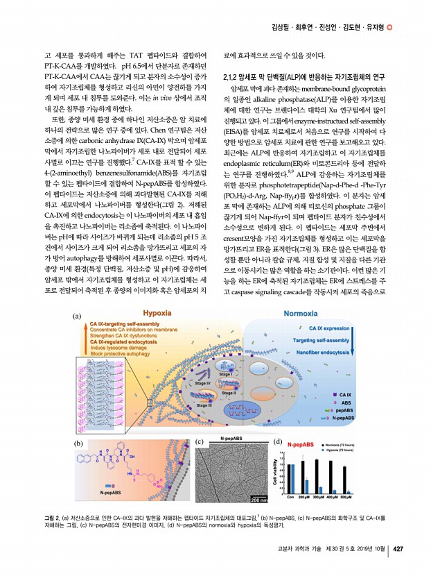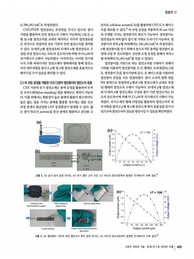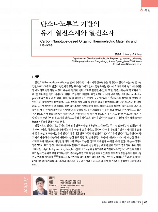 특 집 고분자 과학과 기술 제 30 권 5 호 2019년 10월 421 탄소나노튜브 기반의 유기 열전소재와 열전소자 Carbon Nanotube-based Organic Thermoelectric Materials and Devices 장광석 | Kwang-Suk Jang Department of Chemical and Molecular Engineering, Hanyang University, 55 Hanyangdeahak-ro, Sangnok-gu, Ansan, Gyeonggi-do 15588, Korea E-mailkjang@hanyang.ac.kr 장광석 2003 KAIST 생명화학공학과 학사 2009 KAIST 생명화학공학과 박사 2009-2011 Georgia Institute of Technology Post-Doc. 2011-2016 한국화학연구원 선임연구원 2016-2018 한경대학교 화학공학과 조교수 2018-현재 한양대학교 화학분자공학과 부교수 1. 서론 열전효과 thermoelectric effect 는 열 에너지와 전기 에너지의 상호변환을 의미한다. 열전소자는 p형 및 n형 열전소재가 교대로 번갈아 연결되어 있는 구조를 가지고 있다. 열전소자는 펠티어 효과에 의해 전기 에너지를 열 에너지...