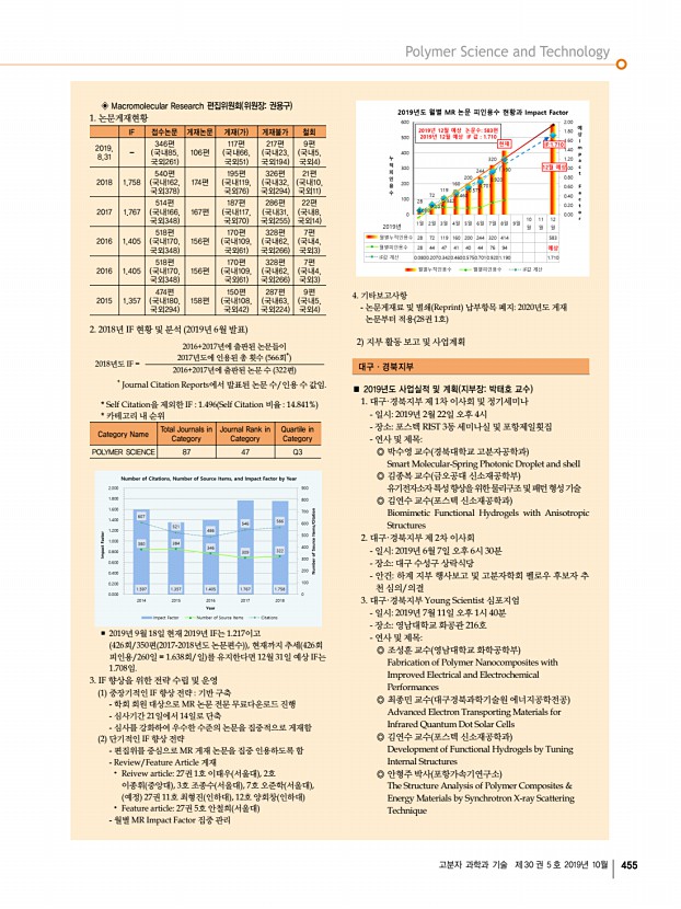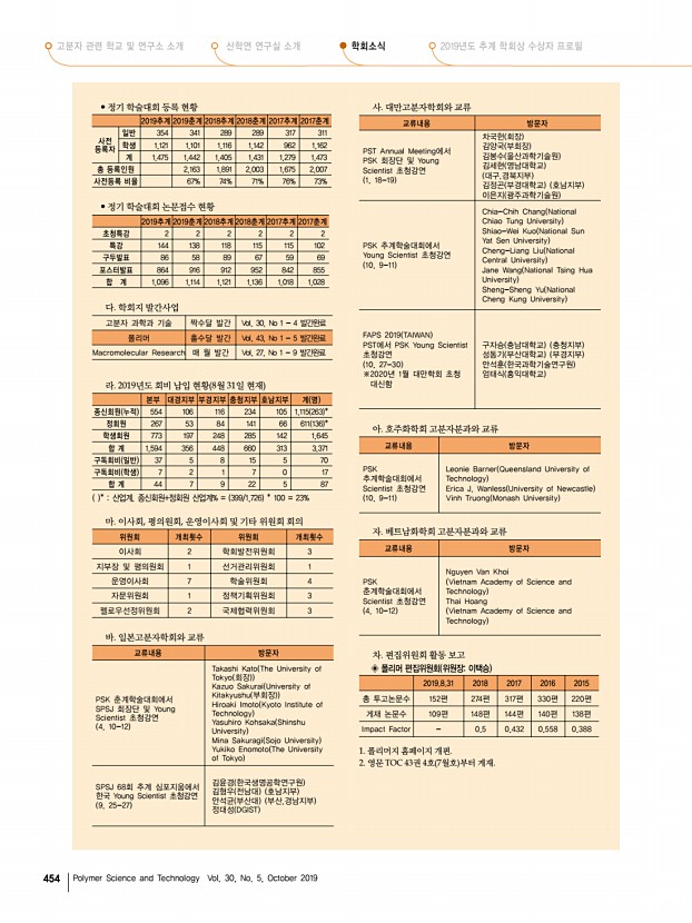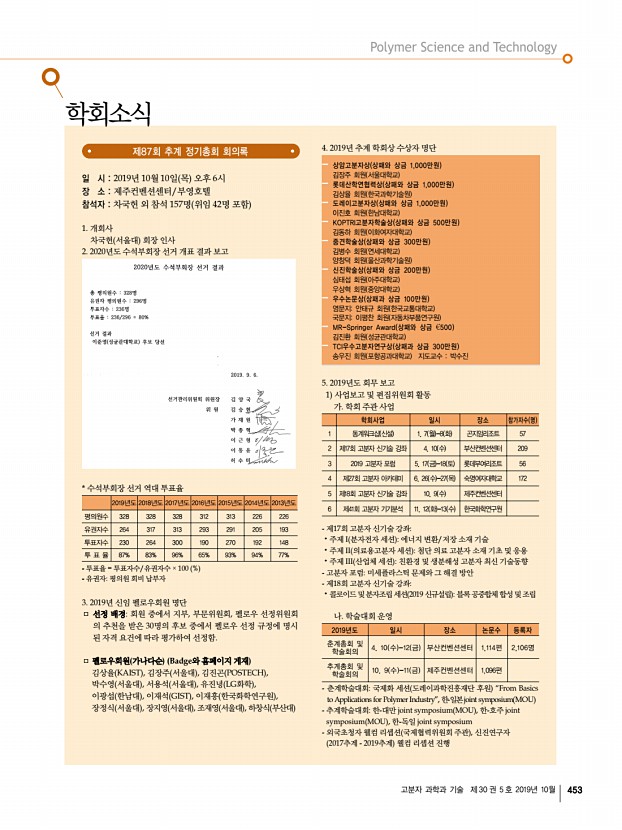 ... 289 317 311 학생 1,121 1,101 1,116 1,142 962 1,162 계 1,475 1,442 1,405 1,431 1,279 1,473 총 등록인원 2,163 1,891 2,003 1,675 2,007 사전등록 비율 67% 74% 71% 76% 73% • 정기 학술대회 논문접수 현황 2019추계 2019춘계 2018추계 2018춘계 2017추계 2017춘계 초청특강 2 2 2 2 2 2 특강 144 138 118 115 115 102 구두발표 86 58 89 67 59 69 포스터발표 864 916 912 952 842 855 합 계 1,096 1,114 1,121 1,136 1,018 1,028 다. 학회지 발간사업 고분자 과학과 기술 짝수달 발간 Vol. 30, No 1 4 발간완료 폴리머 홀수달 발간 Vol. 43, No 1 5 발간완료 Macromolecular Research 매 월 발간 Vol. 27, No 1 9 발간완료 라. 2019년도 회비 납입 현황 8월 31일 현재 본부 대경지부 부경지부 충청지부 호남지부 계 명 종신회원 누적 554 106 116 234 105 1,115 263 * 정회원 267 53 84 141 66 611 136 * 학생회원 773 197 248 285 142 1,645 합 계 1,594 356 448 660 313 3,371 구독회비 일반 37 5 8 1...