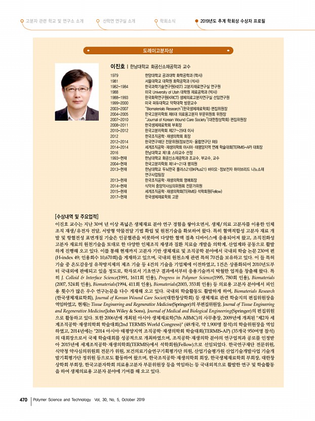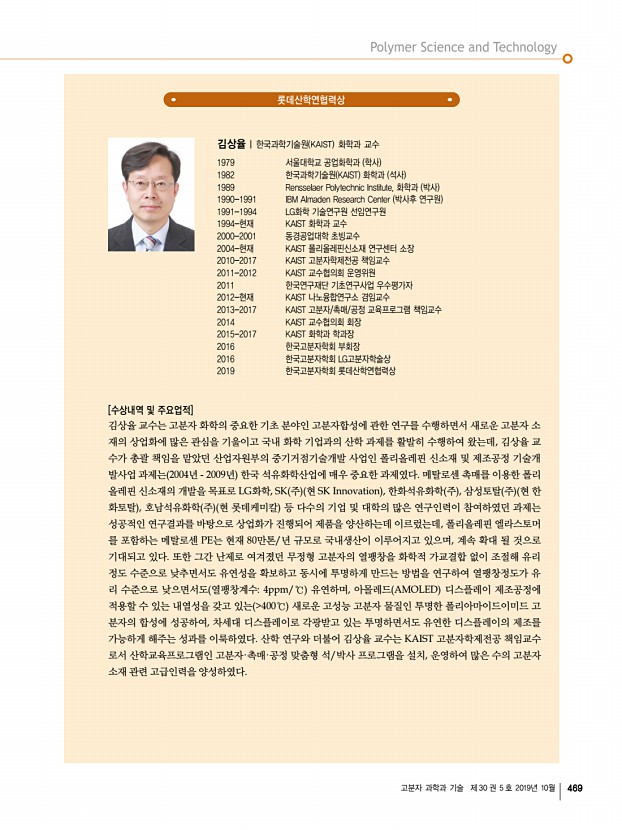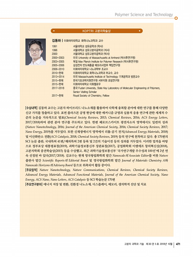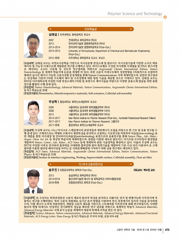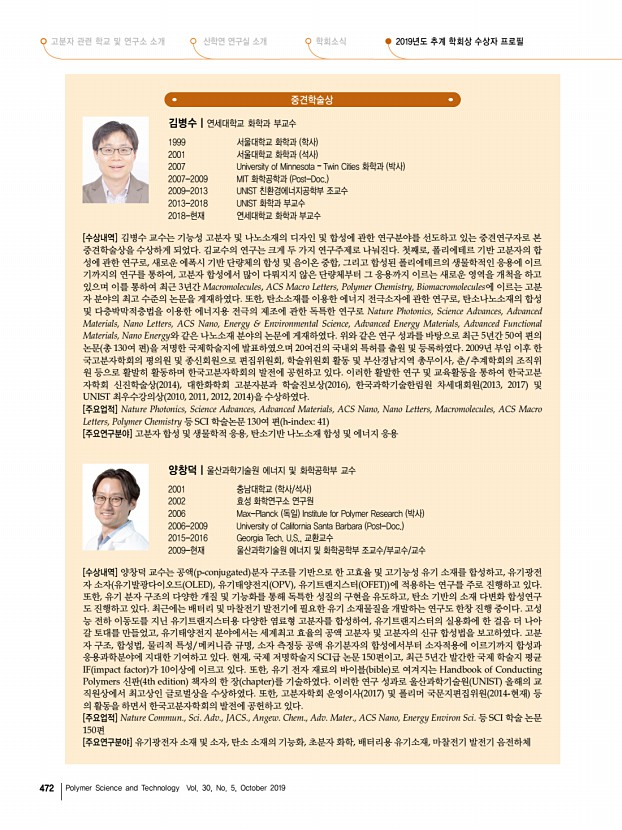 ...건의 국내외 특허를 출원 및 등록하였다. 2009년 부임 이후 한 국고분자학회의 평의원 및 종신회원으로 편집위원회, 학술위원회 활동 및 부산경남지역 총무이사, 춘/추계학회의 조직위 원 등으로 활발히 활동하며 한국고분자학회의 발전에 공헌하고 있다. 이러한 활발한 연구 및 교육활동을 통하여 한국고분 자학회 신진학술상 2014 , 대한화학회 고분자분과 학술진보상 2016 , 한국과학기술한림원 차세대회원 2013, 2017 및 UNIST 최우수강의상 2010, 2011, 2012, 2014 을 수상하였다. [주요업적] Nature Photonics, Science Advances, Advanced Materials, ACS Nano, Nano Letters, Macromolecules, ACS Macro Letters, Polymer Chemistry 등 SCI 학술논문 130여 편 h-index41 [주요연구분야] 고분자 합성 및 생물학적 응용, 탄소기반 나노소재 합성 및 에너지 응용 양창덕|울산과학기술원 에너지 및 화학공학부 교수 2...