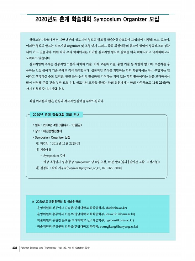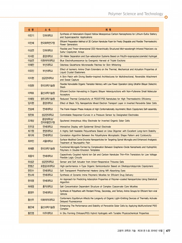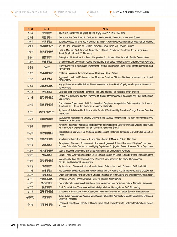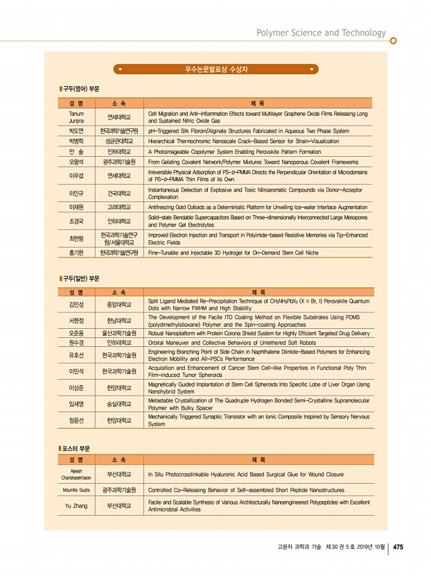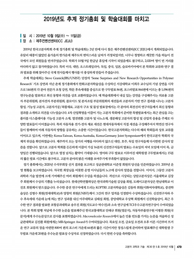 고분자 과학과 기술 제 30 권 5 호 2019년 10월 479 2019년도 추계 정기총회 및 학술대회를 마치고 일 시 2019년 10월 9일 수 11일 금 장 소 제주컨벤션센터 ICC JEJU 2019년 한국고분자학회 추계 정기총회 및 학술대회는 2년 만에 다시 찾은 제주컨벤션센터 ICC JEJU 에서 개최되었습니다. 유달리 태풍이 많았던 올가을의 한가운데 제주도의 변덕스러운 날씨가 걱정되었지만, 너무나 청명하고 깨끗한 가을 하늘이 전 국에서 모인 회원들을 반겨주었습니다. 학회가 10월 9일 한글날 휴일에 시작이 되었음에도 불구하고, 2,020여 명이 먼 거리를 마다하지 않고 참가하였습니다. 특히 미국, 대만, 오스트레일리아, 독일, 중국, 일본, 슬로바키아에서 본 학회와 교류와 연구 결 과 발표를 위해 찾아주신 국제 연사들께서 행사를 더 풍성하게 만들어 주셨습니다. 추계 학술대회는 Ste...