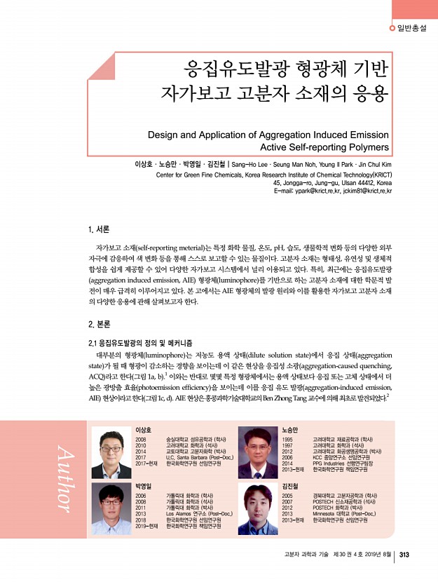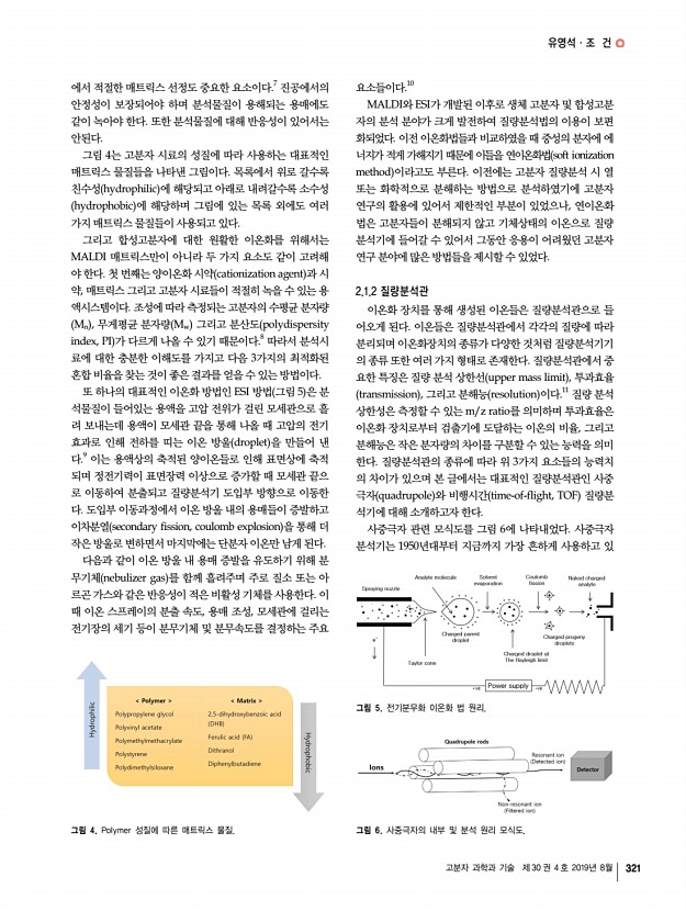 고분자 특성분석 지상강좌 고분자 과학과 기술 제 30 권 4 호 2019년 8월 319 유영석 2014 한남대학교 화학과 학사 2016 한남대학교 화학과 석사 2016-2017 한국지질자원연구원 석사후연수자 2018-현재 한국기초과학지원연구원 연구원 조 건 1996 한림대학교 화학과 학사 1998 서강대학교 화학과 석사 2012 서강대학교 화학과 박사 2013-2015 University of Florida 전기과 Post-Doc. 1998-현재 한국기초과학지원연구원 선임연구원 질량분석기를 이용한 고분자 분석연구 Study on Synthesis Polymer Using Mass Spectrometry 유영석ㆍ조 건 | Yeongsuk YooㆍKun Cho Korean Basic Science Institute, 162, Yeongudanji-ro, Ochang-eup, Cheongwon-gu, Cheongju-si, Chungbuk 28119, Korea E-mailchokun@kbsi.re.kr 1. 서론 합성고분자는 석유의 분류 생성물이나 석탄을 원료로 하여 인공적으로 합성된 물질로 합성 섬유, 합성수지, 합성 고무 등 많은 합...