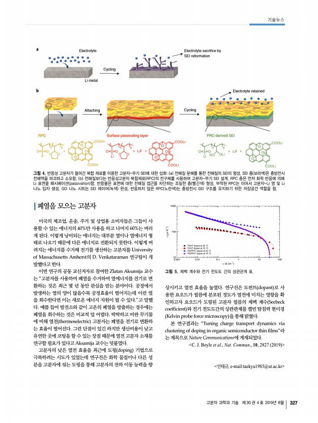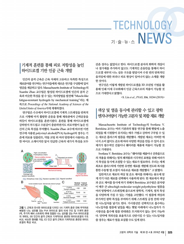 고분자 과학과 기술 제 30 권 4 호 2019년 8월 325 그림 1. 근육과 유사한 하이드로겔 디자인A 기계적 훈련 전에 무작위로 배향된 나노 섬유를 갖는 PVA 하이드로 겔의 미세 구조 및 기계적 훈련 즉, 주기적 예비 스트레치 후에 정렬된 나노 섬유를 갖는 PVA 하이드로겔 의 개략도, B 인간의 골격 근육과 기계적으로 훈련된 하이드로겔의 구조 비교, 비슷한 형태를 가짐, C 인간 골격 근육과 기계적으로 훈련된 하이드 로겔의 특성 비교. 기계적 훈련를 통해 피로 저항성을 높인 하이드로겔 기반 인공 근육개발 인간의 골격 근육은 근육 자체의 고유하고 독특한 특성으로 재료분야를 연구하는 연구자들에게 새로운 연구를 구상함에 있어 영감을 제공하고 있다. Massachusetts Institute of Technology의 Xuanhe Zhao 교수팀은 합성된 하이드로겔에 인간의 골격 근 육과 비슷한 특성...