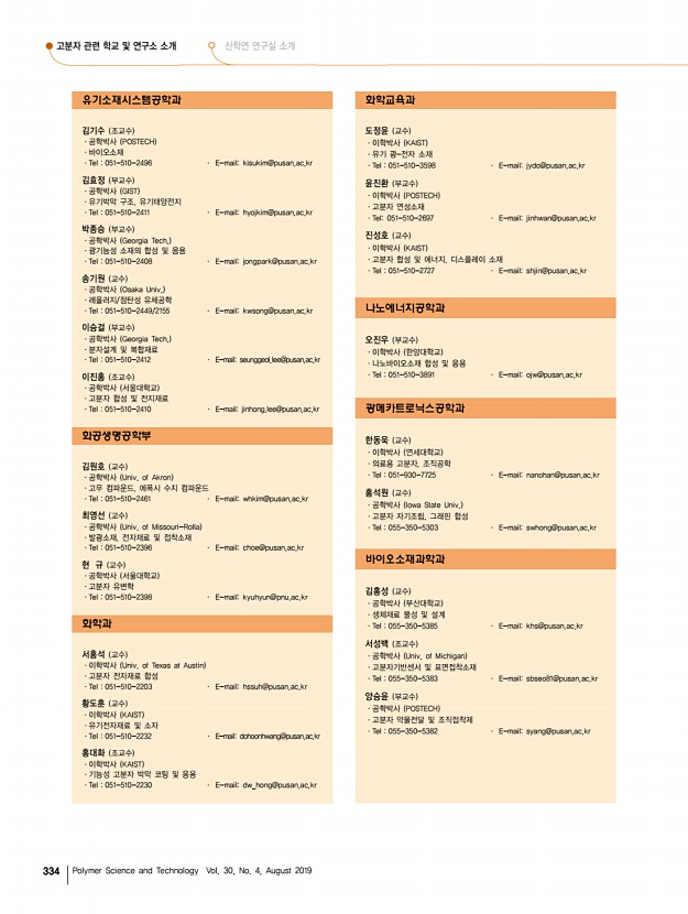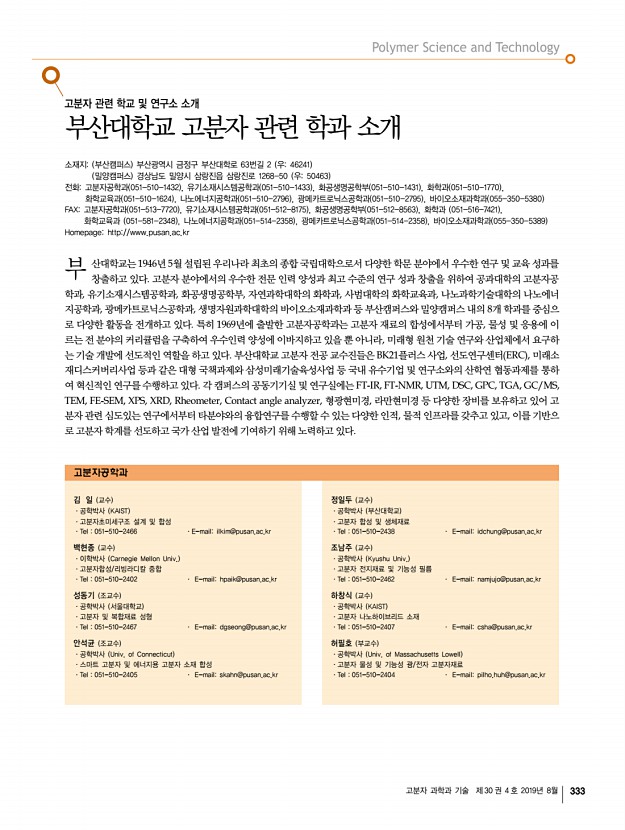 고분자 과학과 기술 제 30 권 4 호 2019년 8월 333 부 고분자 관련 학교 및 연구소 소개 부산대학교 고분자 관련 학과 소개 소재지부산캠퍼스 부산광역시 금정구 부산대학로 63번길 2 우46241 밀양캠퍼스 경상남도 밀양시 삼랑진읍 삼랑진로 1268-50 우50463 전화고분자공학과 051-510-1432 , 유기소재시스템공학과 051-510-1433 , 화공생명공학부 051-510-1431 , 화학과 051-510-1770 , 화학교육과 051-510-1624 , 나노에너지공학과 051-510-2796 , 광메카트로닉스공학과 051-510-2795 , 바이오소재과학과 055-350-5380 FAX고분자공학과 051-513-7720 , 유기소재시스템공학과 051-512-8175 , 화공생명공학부 051-512-8563 , 화학과 051-516-7421 , 화학교육과 051-581-2348 , 나노에너지공학과 051-514-2358 , 광메카트로닉스공학과 051-514-2358 , 바이오소재과학과 055-350-5389 Homepagehttp//www.pusan.ac.kr 산대학교는 1946년 5월 설립된 ...