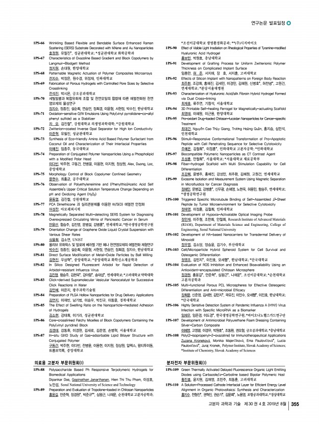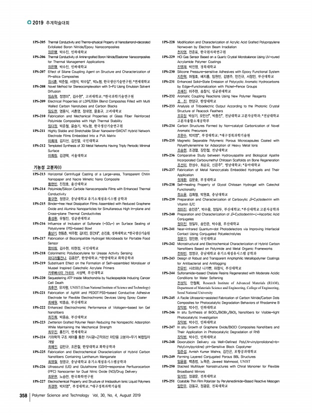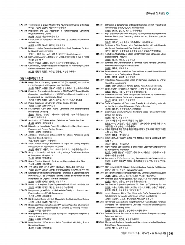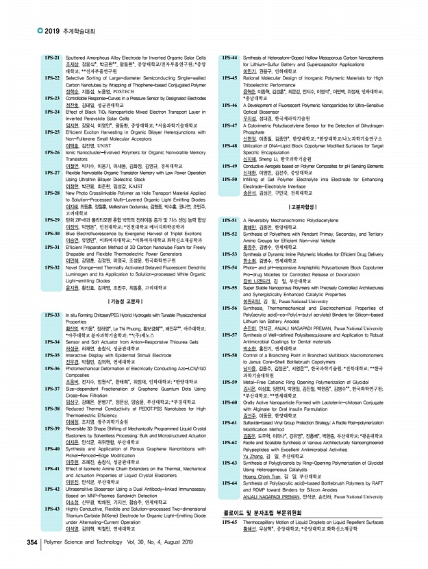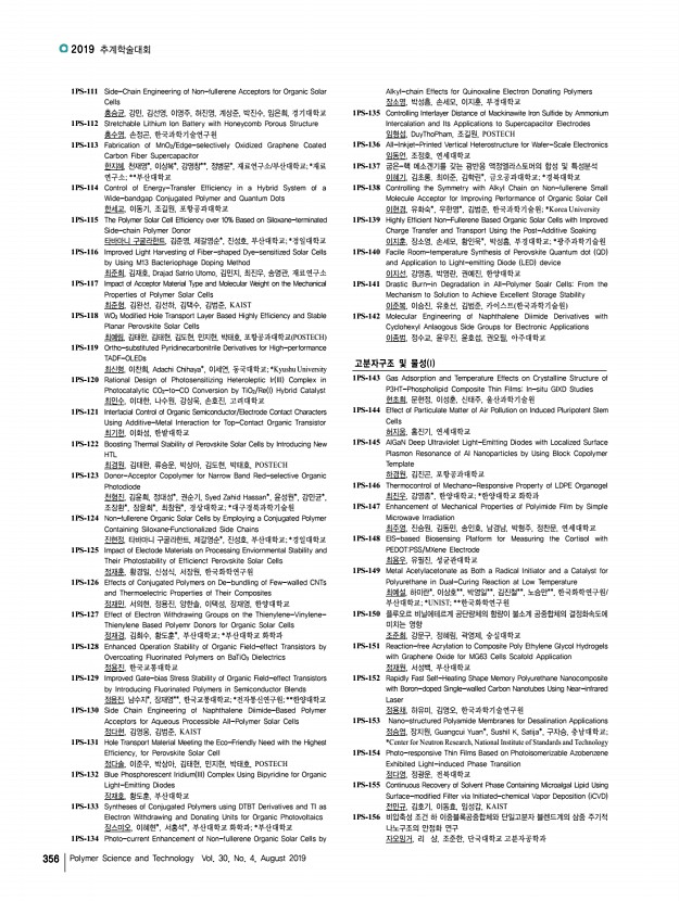 2019 추계학술대회 356 Polymer Science and Technology Vol. 30, No. 4, August 2019 1PS-111 Side-Chain Engineering of Non-fullerene Acceptors for Organic Solar Cells 홍승균, 강민, 김선영, 이영주, 허진영, 계상준, 박진수, 임은희, 경기대학교 1PS-112 Stretchable Lithium Ion Battery with Honeycomb Porous Structure 홍수영, 손정곤, 한국과학기술연구원 1PS-113 Fabrication of MnO2/Edge-selectively Oxidized Graphene Coated Carbon Fiber Supercapacitor 한지혜, 천재영*, 이상복*, 강명창**, 정병문*, 재료연구소/부산대학교; *재료 연구소; **부산대학교 1PS-114 Control of Energy-Transfer Efficiency in a Hybrid System of a Wide-bandgap Conjugated Polymer and Quantum Dots 한세교, 이동기, 조길원, 포항공과대학교 1PS-115 The Polymer Solar Cell Efficiency over 10% Based on Siloxane-terminated Side-chain Polymer Donor 타바마니 구굴라한트, 김준영, 제갈영순*, 진성호, 부산대학교; *경일대학교 ...