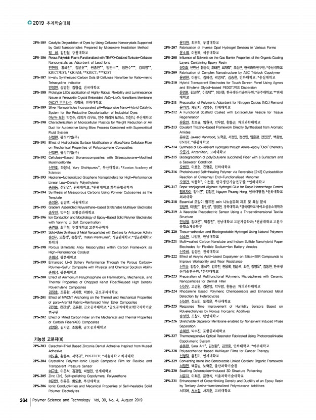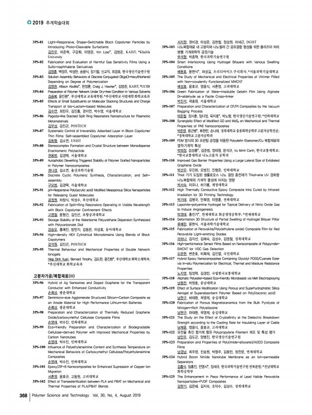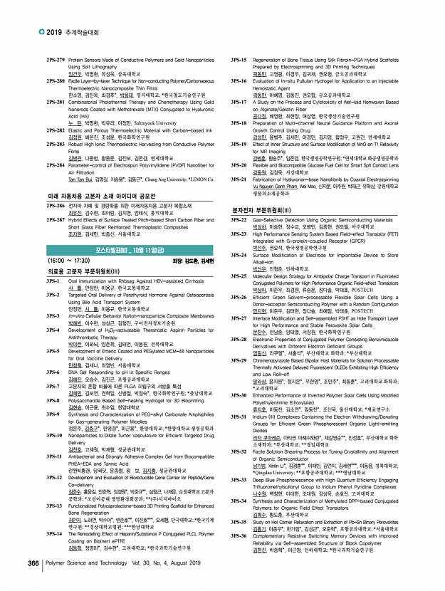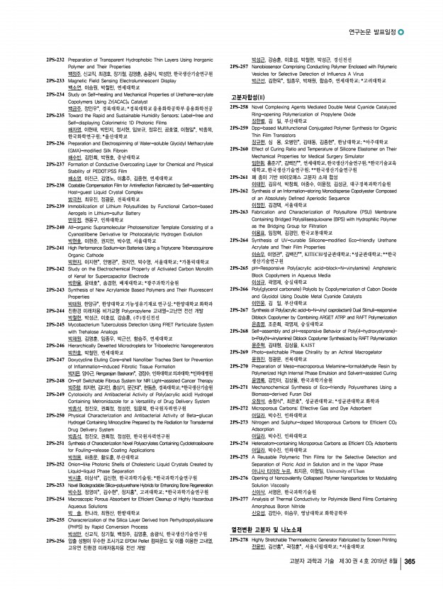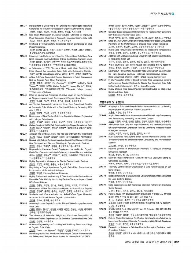 연구논문 발표일정 고분자 과학과 기술 제 30 권 4 호 2019년 8월 367 3PS-37 Development of Deep-red to NIR Emitting tris-Heteroleptic Iridium III Complexes for Solution-processable Organic Light-emitting Diodes 김태현, 김해운, 김도현, 정다솔, 최예림, 박태호, POSTECH 3PS-38 Side Chain Modification of Alcohol-soluble Fullerenes for Improving Power Conversion Efficiencies of Aqueously-processed Organic Solar Cells 김창균, 김영권, 최나연, 김범준, 한국과학기술원 3PS-39 Synthesis of Trifluorosulfonyl Substituted Iridium Complexes for Blue Phosphorescence 김지현, 하연희, 김윤희, 권순기, 정성준*, 손선영*, 한승훈, 김봉곤, 안형주*, 경상대학교; *포항공과대학교 3PS-40 Enhanced High Performance of Inverted Polymer Solar Cells Using New Small-molecule Electrolyte Doped ZnO as the Electron Transport Layer 김주현, 홍성수*, 이근대**, 안병현***, 부경대학교; *부경대학교 화학공학과; **...