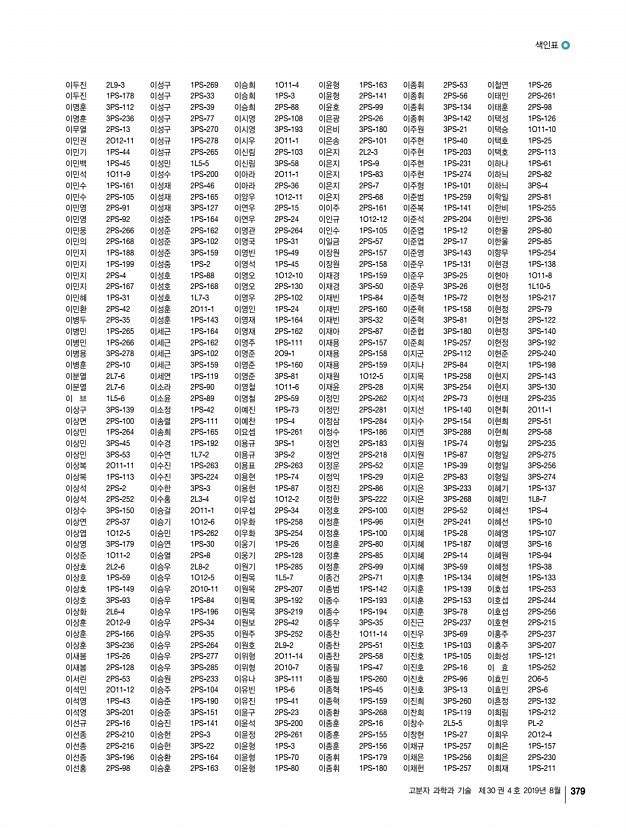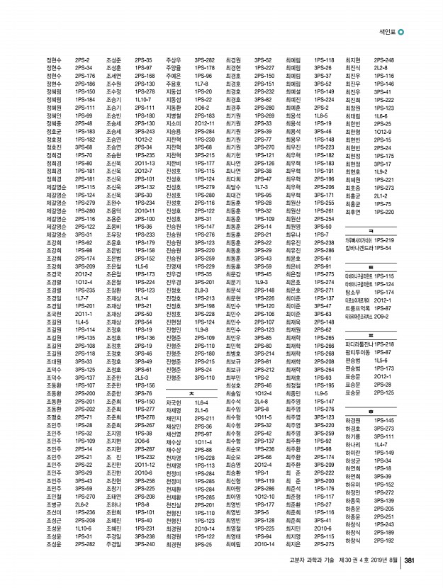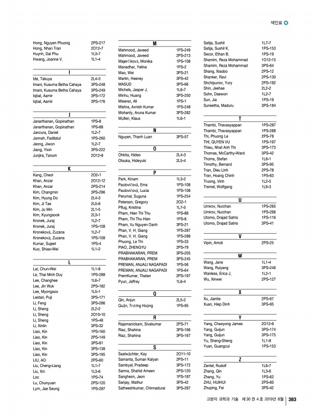 색인표 고분자 과학과 기술 제 30 권 4 호 2019년 8월 383 Hong, Nguyen Phuong 2PS-217 Hong, Nhan Tran 2O12-7 Huynh, Dai Phu 1L3-7 Hwang, Joanne V. 1L1-4 I Ide, Takuya 2L4-3 Imani, Kusuma Betha Cahaya 3PS-248 Imani, Kusuma Betha Cahaya 3PS-249 Iqbal, Aamir 3PS-172 Iqbal, Aamir 3PS-176 J Janarthanan, Gopinathan 1PS-8 Janarthanan, Gopinathan 1PS-88 Jancura, Daniel 1L2-7 Jannah, Fadilatul 1PS-260 Jeong, Jiwon 1L2-7 Jiang, Yixin 3PS-222 Junjira, Tanum 2O12-8 K Kang, Cheol 2O2-1 Khan, Anzar 2O12-12 Khan, Anzar 2PS-214 Kim, Changmin 3PS-286 Kim, Hyung Do 2L4-3 Kim, Ji Tae 2L5-6 Kim, Ju Min 2L1-5 Kim, Kyungsook 2L3-1 Kronek, Juraj 1L2-7 Kronek, Juraj 1PS-108 Kroneková, Zuzana 1L2-7 Kroneková, Zuzana 1PS-108 Kumar, Sujeet 1PS-4 Kuo, Shiao-Wei 1L1-2 L Lai, Chun-Wei 1L1-8 Le, Thai Minh Duy 1PS-288 Lee, Changhee 1L6-7 Lee, Jin Wuk 2PS-182 Lee, Myongsoo 1L5-1 Lestari, Puji 3PS-171 Li, Feng 3PS-286 Li, Sheng 2L2-2 Li, Sheng 2O10-10 Li, Sheng 1PS-48 Li, Xinlin 3PS-32 Liao, Kin 1PS-160 ...