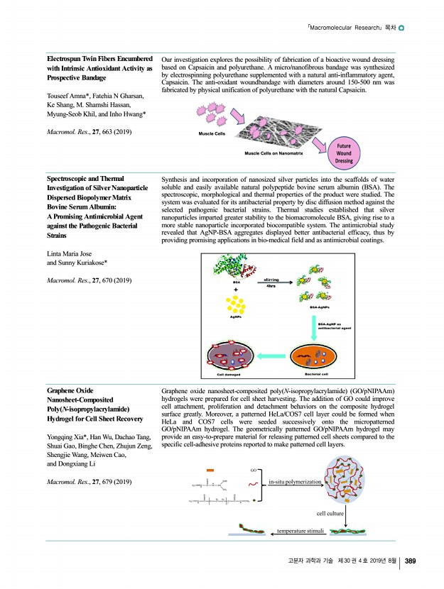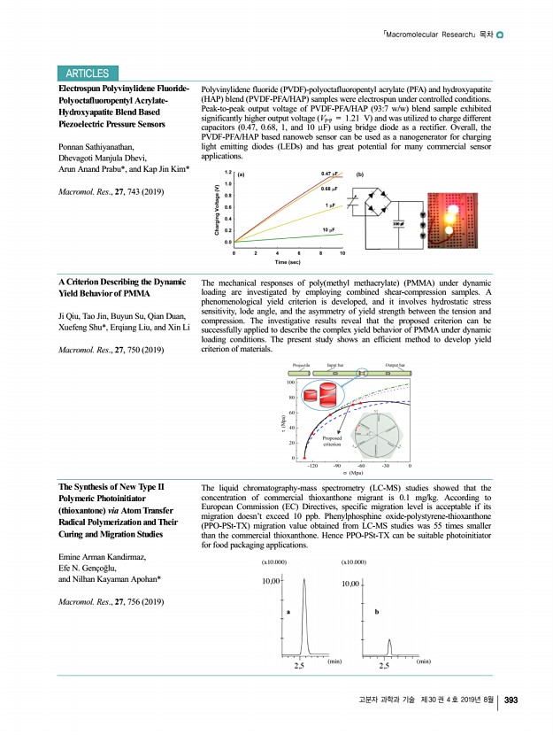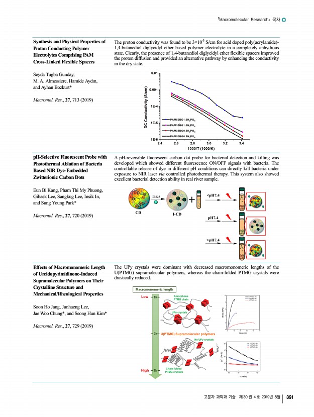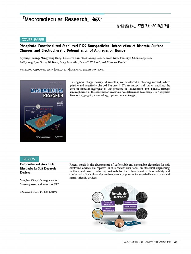 고분자 과학과 기술 제 30 권 4 호 2019년 8월 387 「Macromolecular Research」목차 정기간행영문지_ 27권 7호 ․ 2019년 7월 To engineer charge density of micelles, we developed a blending method, where pristine and negatively charged Pluronic F127s are mixed, and further stabilized the core of micellar aggregate in the presence of fluorescence dye. Finally, through electrophoresis of the charged soft materials, we determined how many F127 polymers form one aggregate, so-called aggregation number Nagg COVER PAPER Phosphate-Functionalized Stabilized F127 NanoparticlesIntroduction of Discrete Surface Charges and Electrophoretic Determination of Aggregation Number Juyoung Hwang, Mingyeong Kang, Mila Irva Sari, Tae Hyeong Lee, Kibeom Kim, Yeol Kyo Choi, Eunji Lee, Ja-Hyoung Ryu, Seung Ki Baek, Dong June Ahn, Peter C. W. Lee*, and Minseok Kwak* Vol. 27, No. 7, pp 657-662 2019 │JUL 25, 2019│DOI 10.1007/s13233-019-7100-x REVIEW Deformable and Stretchable Electrodes ...