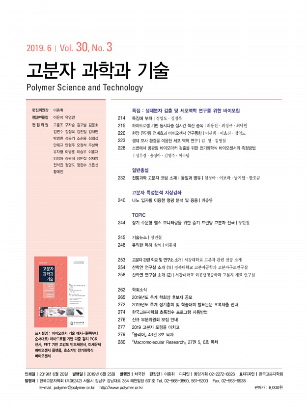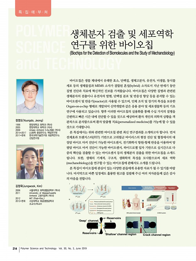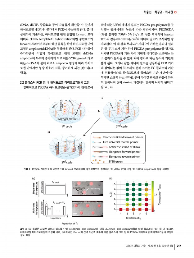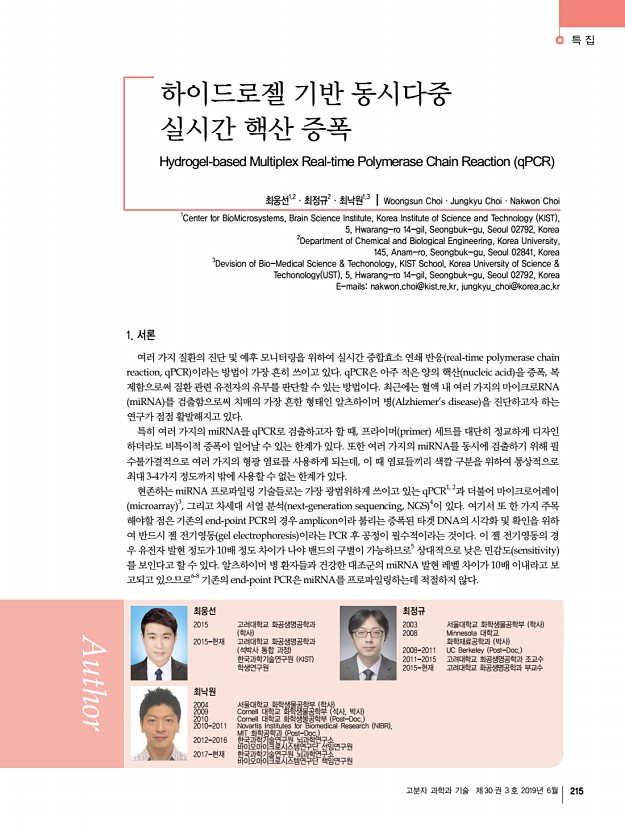 특 집 고분자 과학과 기술 제 30 권 3 호 2019년 6월 215 하이드로젤 기반 동시다중 실시간 핵산 증폭 Hydrogel-based Multiplex Real-time Polymerase Chain Reaction qPCR 최웅선1,2ㆍ최정규2ㆍ최낙원1,3 | Woongsun ChoiㆍJungkyu ChoiㆍNakwon Choi 1 Center for BioMicrosystems, Brain Science Institute, Korea Institute of Science and Technology KIST , 5, Hwarang-ro 14-gil, Seongbuk-gu, Seoul 02792, Korea 2 Department of Chemical and Biological Engineering, Korea University, 145, Anam-ro, Seongbuk-gu, Seoul 02841, Korea 3Devision of Bio-Medical Science & Techonology, KIST School, Korea University of Science & Techonology UST , 5, Hwarang-ro 14-gil, Seongbuk-gu, Seoul 02792, Korea E-mailsnakwon.choi@kist.re.kr, jungkyu_choi@korea.ac.kr 최웅선 2015 고려대학교 화공생명공학과 학사 2015-현재 고려대학교 화공생명공학과 석박사 통합 과정 한국과학기술연구원 KIST 학생연구원 최정규 2003 서울대학교 화학생...