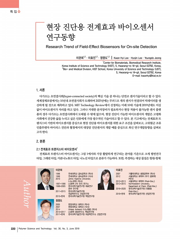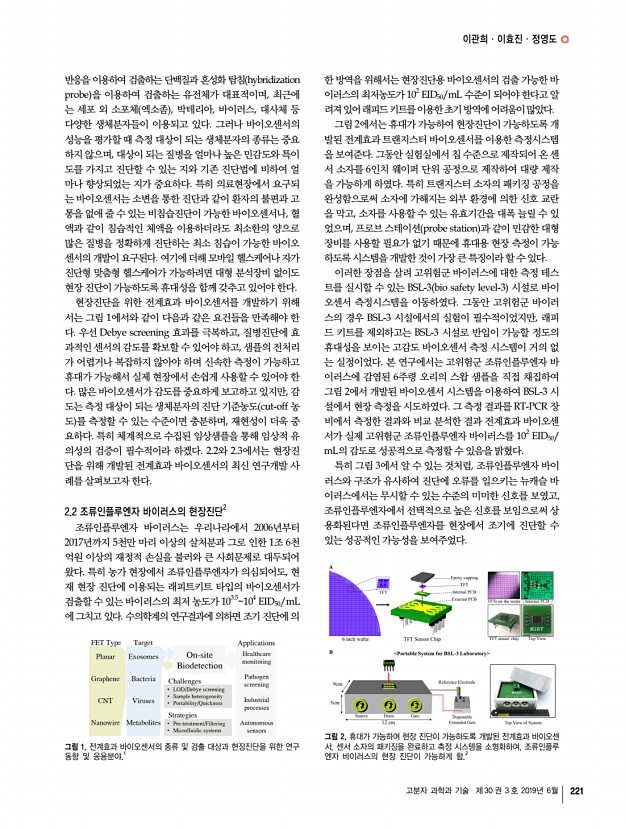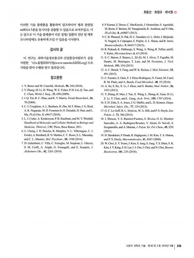 최웅선ㆍ최정규ㆍ최낙원 고분자 과학과 기술 제 30 권 3 호 2019년 6월 219 이러한 기술 플랫폼을 활용하여 알츠하이머 병과 관련된 miRNA 5종을 동시다중 검출할 수 있음으로 보여주었고, 이 는 앞으로 이 기술 플랫폼이 다른 질병/질환의 진단 및 예후 모니터링에도 유용하게 쓰일 수 있음을 시사한다. 감사의 글 이 연구는 과학기술정보통신부·산업통상자원부가 공동 지원한 ‘나노융합2020사업 www.nanotech2020.org ’으로 지원을 받아 수행된 연구 결과입니다. 참고문헌 1. V. Benes and M. Castoldi, Methods, 50, 244 2010 2. Y. Zhang, M. Li, H. Wang, W. E. Fisher, P. H. Lin, Q. Yao, and C. Chen, World J. Surg., 33, 698 2009 3. J. Q. Yin, R. C. Zhao, and K. V. Morris, Trends Biotechnol., 26, 70 2008 4. C. J. Creighton, A. L. Benham, H. Zhu, M. F. Khan, J. G. Reid, A. K. Nagaraja, M. D. Fountain Jr, O. Dziadek, D. Han, and L. Ma, PLoS One, 5, e9637 2010 ...