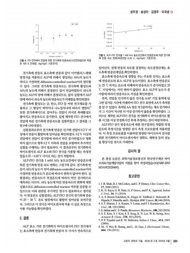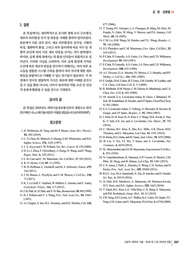 김 영ㆍ김병철 고분자 과학과 기술 제 30 권 3 호 2019년 6월 227 3. 결론 본 특집에서는 생리학적으로 유사한 생체 모사 구조에서, 세포의 외부환경 인지 및 반응을 사례를 통하여 알아보았다. 본문에서 다룬 것과 같이, 세포 외부환경의 강직성, 지형적 특성, 생화학적 환경, 그리고 외부 물리력에 따른 자극 등 개 별적 요인에 따라 다른 세포 반응을 보이는 것이 밝혀졌다. 하지만, 실제 생체 내에서는 위 환경 인자들이 복합적으로 일 어난다. 이러한 사실을 고려하여, 더욱 실제 환경에 가까운 조건에 따른 세포의 반응을 연구하기 위해서는, 여러 외부 요 소들을 결합한 시스템 구축을 통하여 여러 자극에 대한 세포 반응을 종합적으로 이해할 수 있는 연구들이 필요하다. 각 과 정에서 얻어진 생물학적 지식은 세포에 대한 이해를 증진시 킬 수 있을 뿐만 아...