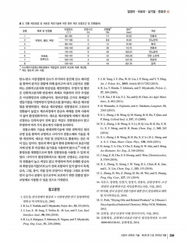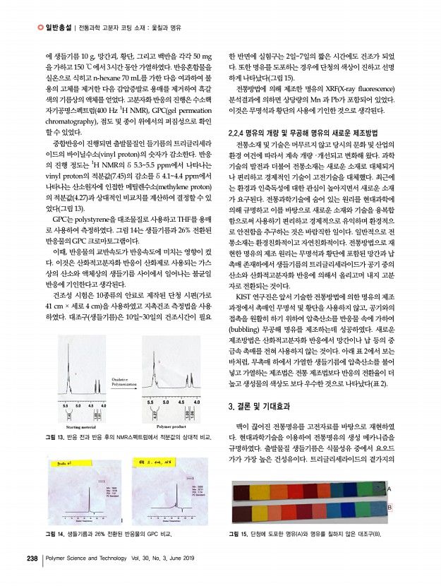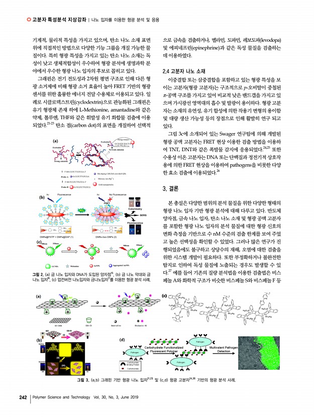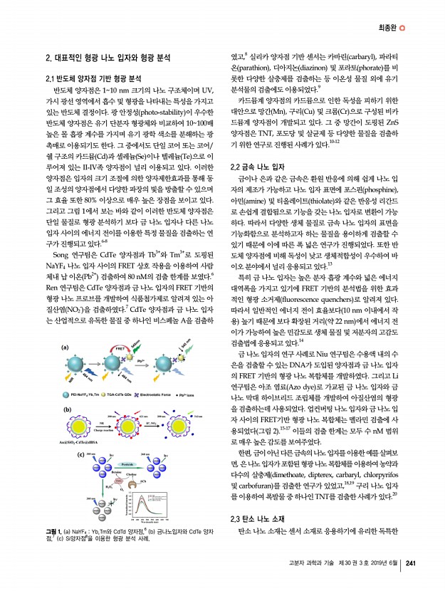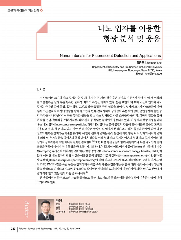 고분자 특성분석 지상강좌 240 Polymer Science and Technology Vol. 30, No. 3, June 2019 최종완 2006 한양대학교 화학과 학사 2009 한양대학교 화학과 석사 2016 한양대학교 화학과 이학박사 2016-현재 삼육대학교 화학생명과학과 조교수 나노 입자를 이용한 형광 분석 및 응용 Nanomaterials for Fluorescent Detection and Applications 최종완 | Jongwan Choi Department of Chemistry and Life Science, Sahmyook University 815, Hwarang-ro, Nowon-gu, Seoul 01795, Korea E-mailjchoi@syu.ac.kr 1. 서론 수 나노미터 크기의 나노 입자는 수 십 개 내지 수 천 개의 원자 혹은 분자로 이루어져 있어 수 억 개 이상의 벌크 물질과는 전혀 다른 독특한 물리적, 화학적 특성을 가지고 있다. 높은 표면적 대 부피 비율로 인하여 나노 입자는 증가된 촉매 특성, 흡착 성질, 그리고 강한 응집력 등의 성질을 보이며, 입자의 크기가 나노화됨에 따라...