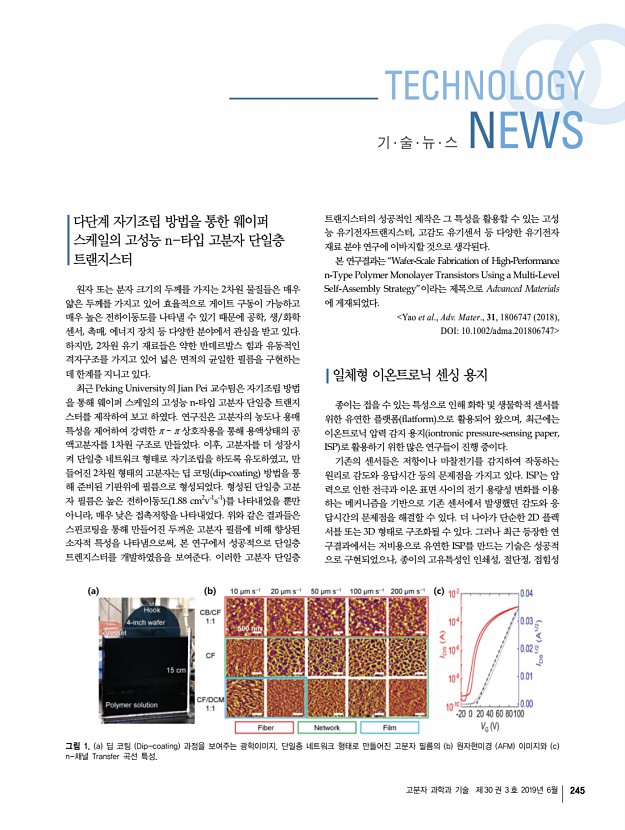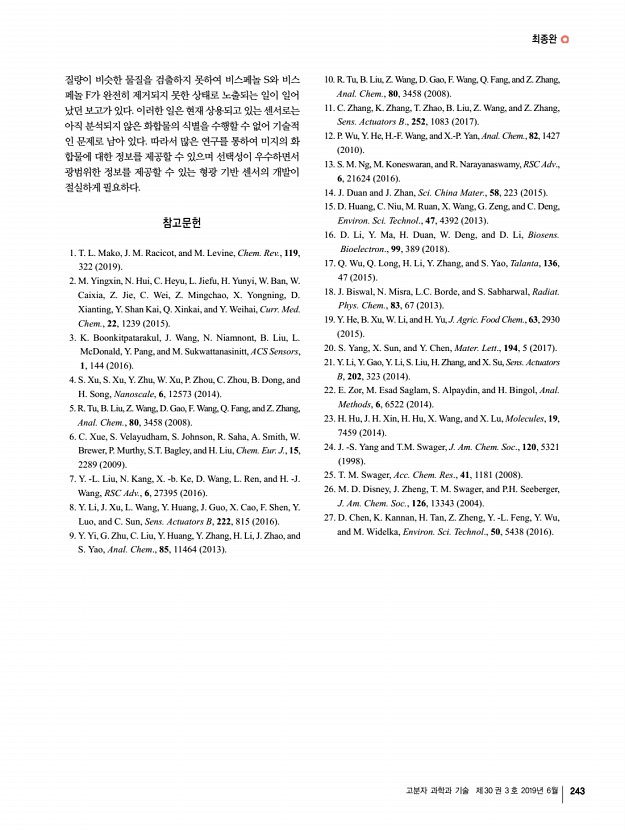 최종완 고분자 과학과 기술 제 30 권 3 호 2019년 6월 243 질량이 비슷한 물질을 검출하지 못하여 비스페놀 S와 비스 페놀 F가 완전히 제거되지 못한 상태로 노출되는 일이 일어 났던 보고가 있다. 이러한 일은 현재 상용되고 있는 센서로는 아직 분석되지 않은 화합물의 식별을 수행할 수 없어 기술적 인 문제로 남아 있다. 따라서 많은 연구를 통하여 미지의 화 합물에 대한 정보를 제공할 수 있으며 선택성이 우수하면서 광범위한 정보를 제공할 수 있는 형광 기반 센서의 개발이 절실하게 필요하다. 참고문헌 1. T. L. Mako, J. M. Racicot, and M. Levine, Chem. Rev., 119, 322 2019 2. M. Yingxin, N. Hui, C. Heyu, L. Jiefu, H. Yunyi, W. Ban, W. Caixia, Z. Jie, C. Wei, Z. Mingchao, X. Yongning, D. Xianting, Y. Shan Kai, Q. Xinkai, and Y. Weihai, Curr. Med. Chem., 22, 1239 2015 3. K. Boonkitpatarakul, J. Wang, N. Niamnont, B. Liu, L. McDona...