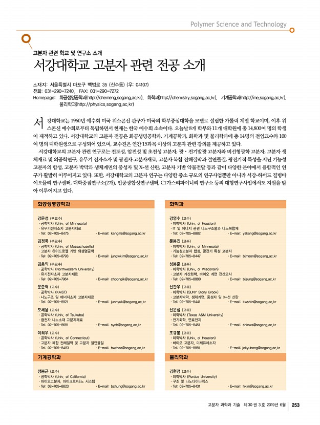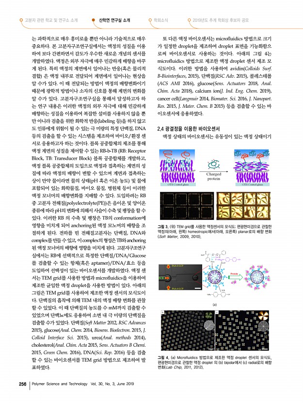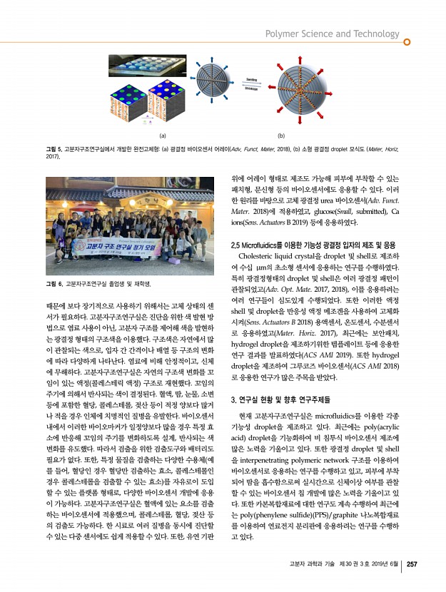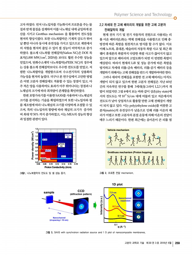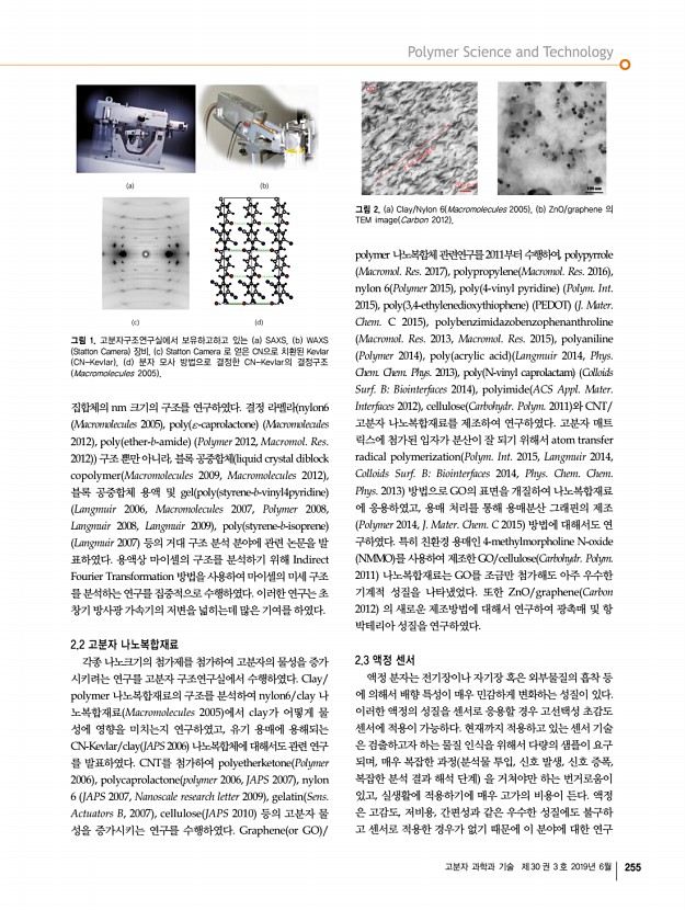 고분자 과학과 기술 제 30 권 3 호 2019년 6월 255 그림 1. 고분자구조연구실에서 보유하고하고 있는 a SAXS, b WAXS Statton Camera 장비. c Statton Camera 로 얻은 CN으로 치환된 Kevlar CN-Kevlar , d 분자 모사 방법으로 결정한 CN-Kevlar의 결정구조 Macromolecules 2005 그림 2. a Clay/Nylon 6 Macromolecules 2005 , b ZnO/graphene 의 TEM image Carbon 2012 집합체의 nm 크기의 구조를 연구하였다. 결정 라멜라 nylon6 Macromolecules 2005 , poly ε-caprolactone Macromolecules 2012 , poly ether-b-amide Polymer 2012, Macromol. Res. 2012 구조 뿐만 아니라, 블록 공중합체 liquid crystal diblock copolymer Macromolecules 2009, Macromolecules 2012 , 블록 공중합체 용액 및 gel poly styrene-b-vinyl4pyridine Langmuir 2006, Macromolecules 2007, Polymer 2008, Langmuir 2008, Langmuir 2009 , poly styrene-b-isoprene Langmuir 2007 등의 거대 구조 분석 분야에 관련 논문을 발 표하였다. 용액상 마이셀의...