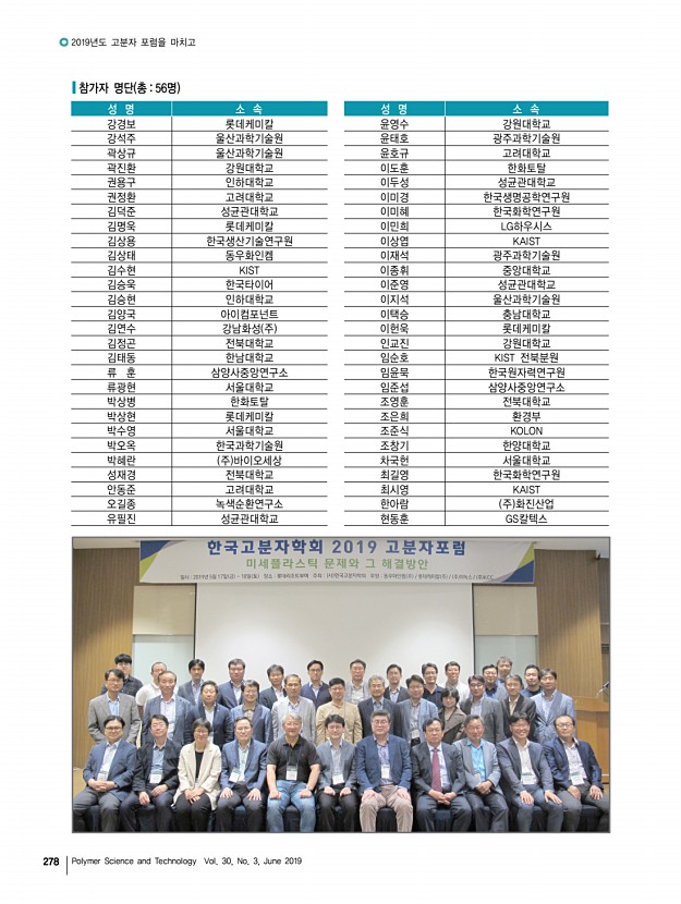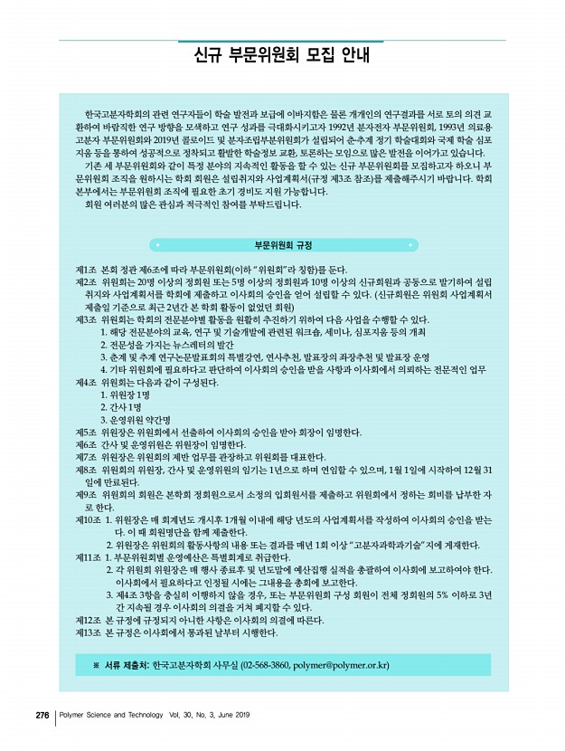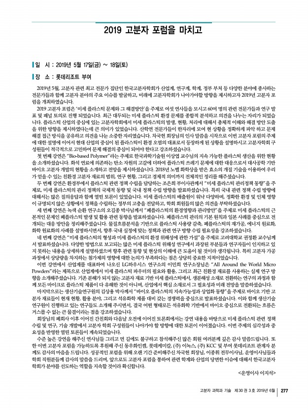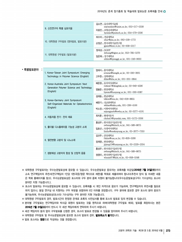 2019년도 춘계 정기총회 및 학술대회 발표논문 초록제출 안내 고분자 과학과 기술 제 30 권 3 호 2019년 6월 273 9. 신진연구자 특별 심포지움 김소연╷울산과학기술원 soyounkim@unist.ac.kr, 052-217-2558 이효민╷포항공과대학교 hyomin@postech.ac.kr, 054-279-2336 10. 대학원생 구두발표 영어발표, 발표15분 허수미╷전남대학교 shur@jnu.ac.kr, 062-530-1772 손정곤╷한국과학기술연구원 jgson@kist.re.kr, 02-958-5317 11. 대학원생 구두발표 발표15분 정대성╷DGIST dchung@dgist.ac.kr, 053-785-5270 임은희╷경기대학교 ehlim@kyonggi.ac.kr, 031-249-9663 ∙ 특별발표분야 1. Korea-Taiwan Joint SymposiumEmerging Technology in Polymer Science English 엄태식╷홍익대학교 ermme@hongik.ac.kr, 02-320-3061 고두현╷경희대학교 dhko@khu.ac.kr, 031-201-3844 2. Korea-Australia Joint SymposiumNext Generation Polymer Science and Technology English 배준원╷동덕여자대학교 r...