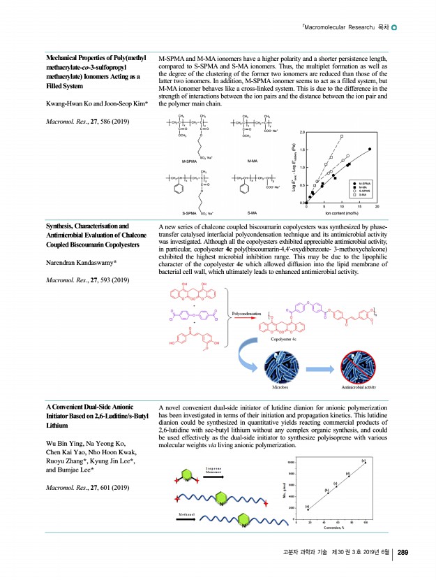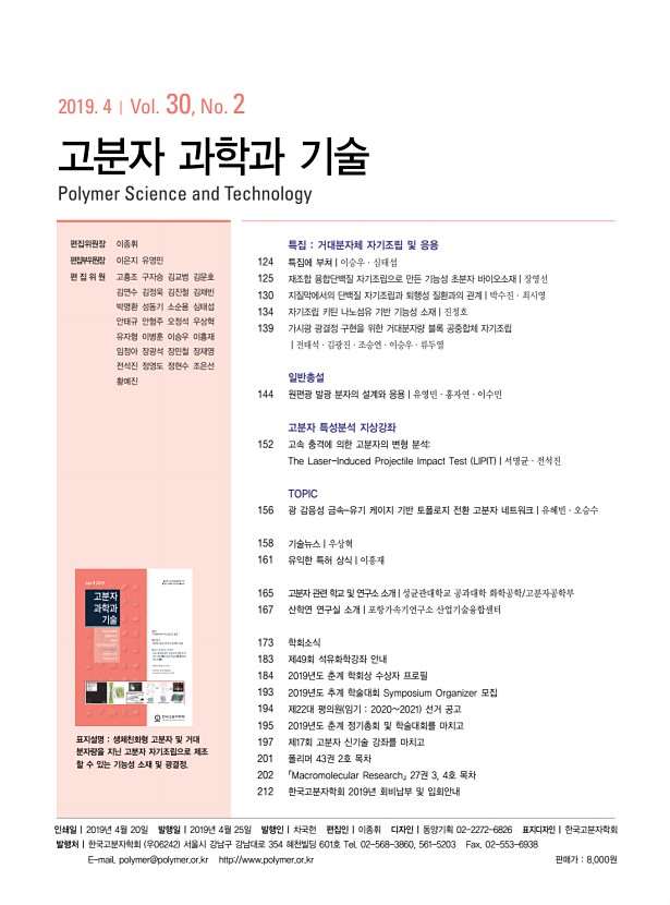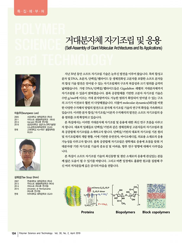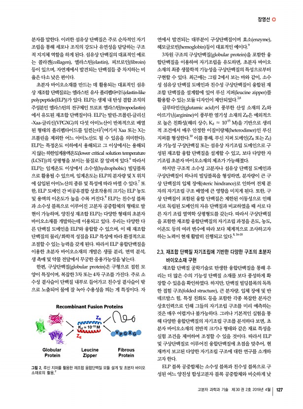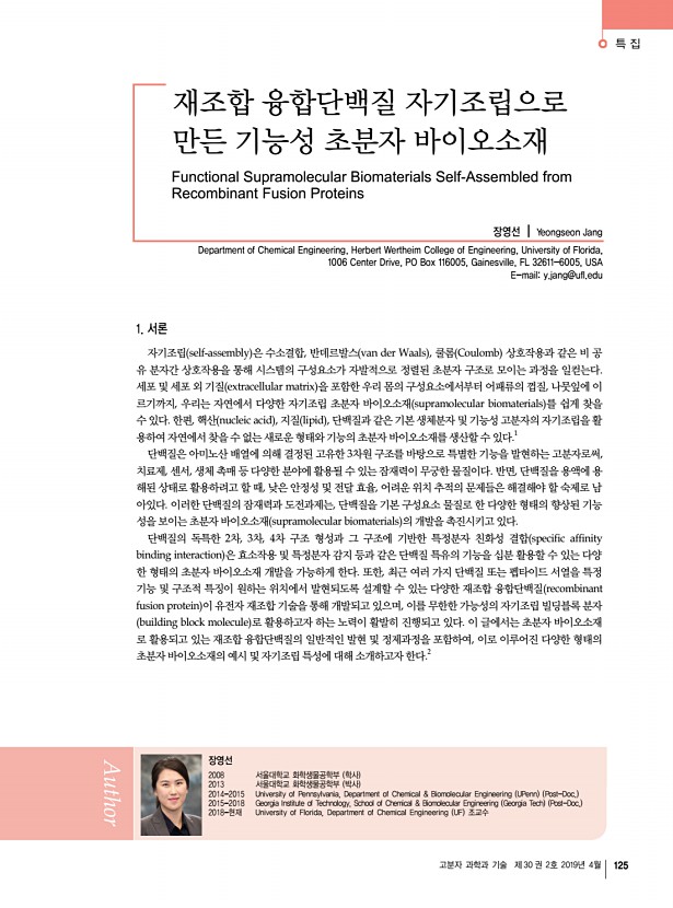 특 집 고분자 과학과 기술 제 30 권 2호 2019년 4월 125 재조합 융합단백질 자기조립으로 만든 기능성 초분자 바이오소재 Functional Supramolecular Biomaterials Self-Assembled from Recombinant Fusion Proteins 장영선 | Yeongseon Jang Department of Chemical Engineering, Herbert Wertheim College of Engineering, University of Florida, 1006 Center Drive, PO Box 116005, Gainesville, FL 32611-6005, USA E-maily.jang@ufl.edu 장영선 2008 서울대학교 화학생물공학부 학사 2013 서울대학교 화학생물공학부 박사 2014-2015 University of Pennsylvania, Department of Chemical & Biomolecular Engineering UPenn Post-Doc. 2015-2018 Georgia Institute of Technology, School of Chemical & Biomolecular Engineering Georgia Tech Post-Doc. 2018-현재 University of Florida, Department of Chemical Engineering UF 조교수 1. 서론 자기조립 self-assembly 은 수소결합, 반데르발스 van der Waals , 쿨롬 Coulomb 상호작용과 같은 비 공 ...