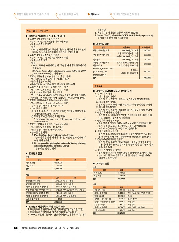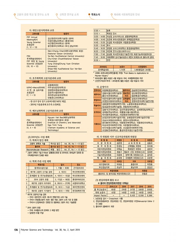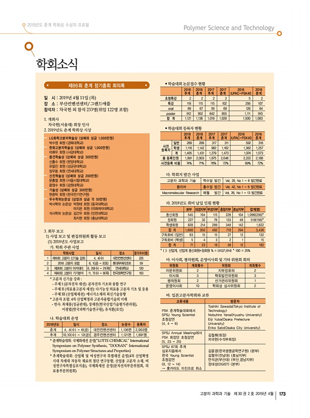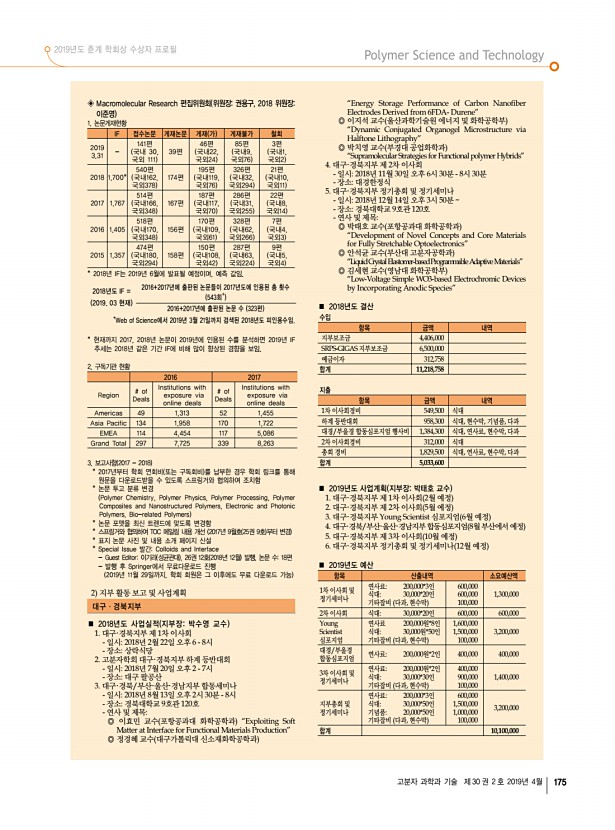 2019년도 춘계 학회상 수상자 프로필 고분자 과학과 기술 제 30 권 2 호 2019년 4월 175 ◈ Macromolecular Research 편집위원회 위원장권용구, 2018 위원장이준영 1. 논문게재현황 IF 접수논문 게재논문 게재 가 게재불가 철회 2019 3.31 141편 국내 30, 국외 111 39편 46편 국내22, 국외24 85편 국내9, 국외76 3편 국내1, 국외2 2018 1.700* 540편 국내162, 국외378 174편 195편 국내119, 국외76 326편 국내32, 국외294 21편 국내10, 국외11 2017 1.767 514편 국내166, 국외348 167편 187편 국내117, 국외70 286편 국내31, 국외255 22편 국내8, 국외14 2016 1.405 518편 국내170, 국외348 156편 170편 국내109, 국외61 328편 국내62, 국외266 7편 국내4, 국외3 2015 1.357 474편 국내180, 국외294 158편 150편 국내108, 국외42 287편 국내63, 국외224 9편 국내5, 국외4 * 2018년 IF는 2019년 6월에 발표될 예정이며, 예측 값임. 2018년도 IF = 2019. 03 현재 2016+201...
