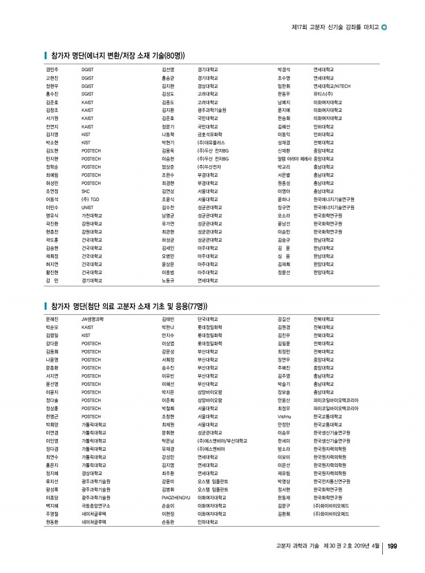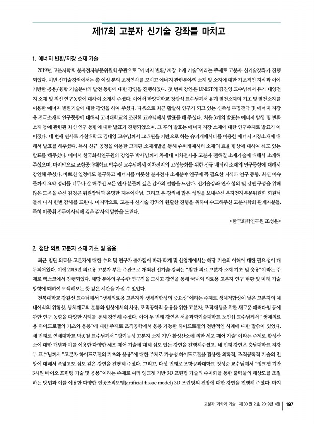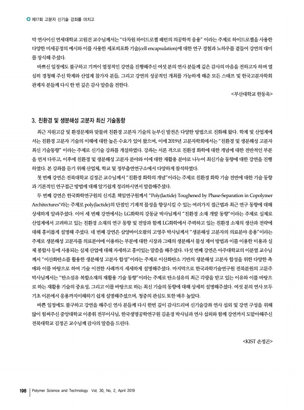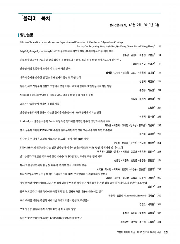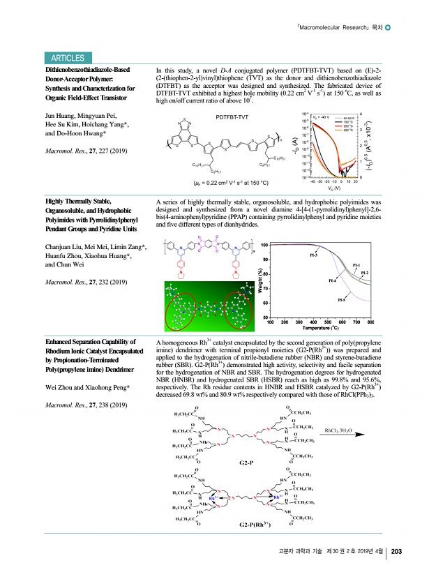 「Macromolecular Research」 목차 고분자 과학과 기술 제 30 권 2 호 2019년 4월 203 ARTICLES Dithienobenzothiadiazole-Based Donor-Acceptor PolymerSynthesis and Characterization for Organic Field-Effect Transistor Jun Huang, Mingyuan Pei, Hee Su Kim, Hoichang Yang*, and Do-Hoon Hwang* Macromol. Res., 27, 227 2019 In this study, a novel D-A conjugated polymer PDTFBT-TVT based on E -2- 2- thiophen-2-yl vinyl thiophene TVT as the donor and dithienobenzothiadiazole DTFBT as the acceptor was designed and synthesized. The fabricated device of DTFBT-TVT exhibited a highest hole mobility 0.22 cm2 V-1 s-1 at 150 oC, as well as high on/off current ratio of above 107. Highly Thermally Stable, Organosoluble, and Hydrophobic Polyimides with Pyrrolidinylphenyl Pendant Groups and Pyridine Units Chanjuan Liu, Mei Mei, Limin Zang*, Huanfu Zhou, Xiaohua Huang*, and Chun Wei Macromol. Res., 27, 232 2019 A series of highly thermally stable, organosoluble, and hydrophobic polyimides was design...