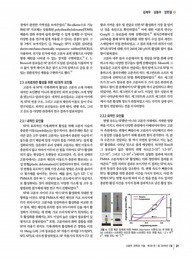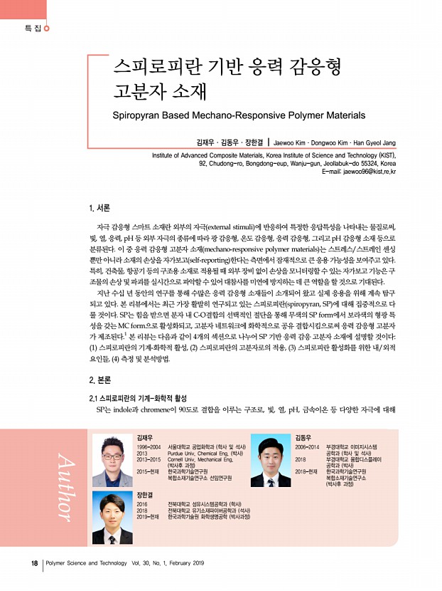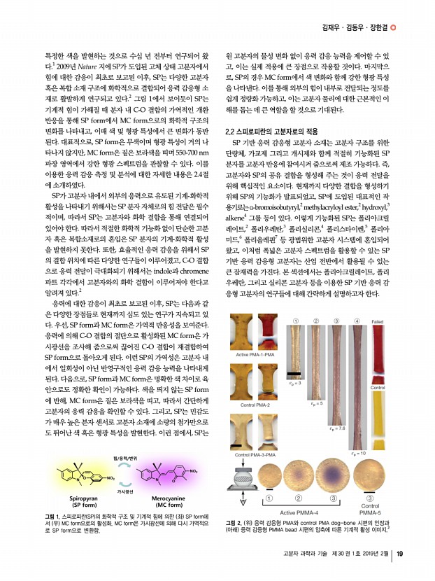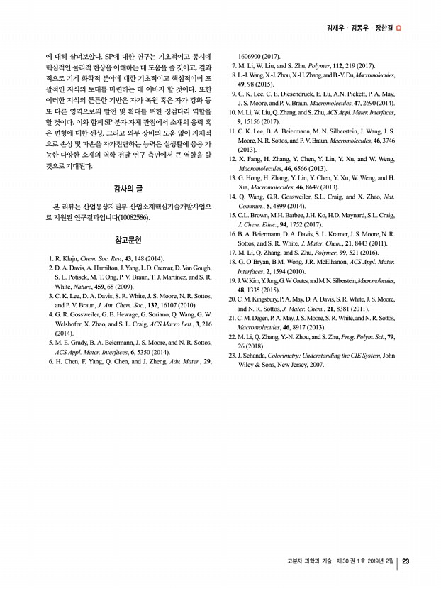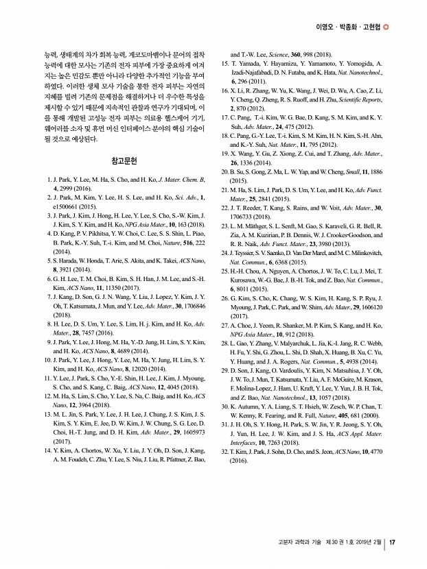 이영오ㆍ박종화ㆍ고현협 고분자 과학과 기술 제 30 권 1 호 2019년 2월 17 능력, 생태계의 차가 회복 능력, 게코도마뱀이나 문어의 접착 능력에 대한 모사는 기존의 전자 피부에 가장 중요하게 여겨 지는 높은 민감도 뿐만 아니라 다양한 추가적인 기능을 부여 하였다. 이러한 생체 모사 기술을 통한 전자 피부는 자연의 지혜를 빌려 기존의 문제점을 해결하거나 더 우수한 특성을 제시할 수 있기 때문에 지속적인 관찰과 연구가 기대되며, 이 를 통해 개발된 고성능 전자 피부는 의료용 헬스케어 기기, 웨어러블 소자 및 휴먼 머신 인터페이스 분야의 핵심 기술이 될 것으로 예상된다. 참고문헌 1. J. Park, Y. Lee, M. Ha, S. Cho, and H. Ko, J. Mater. Chem. B, 4, 2999 2016 2. J. Park, M. Kim, Y. Lee, H. S. Lee, and H. Ko, Sci. Adv., 1, e1500661 2015 3. J. Park, J. Kim, J. Hong, H. Lee, Y. Lee, S. Cho, S.-W. Kim, ...