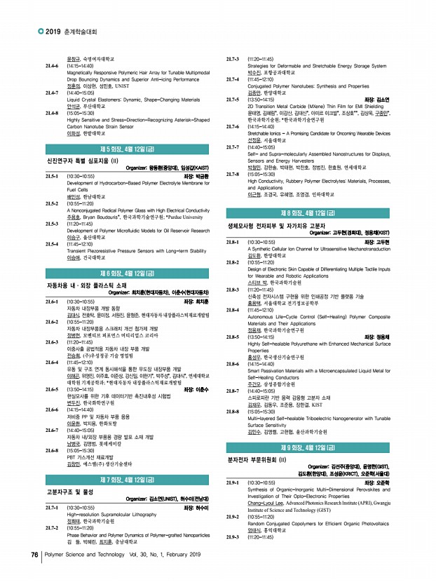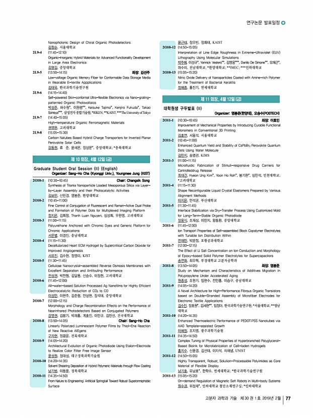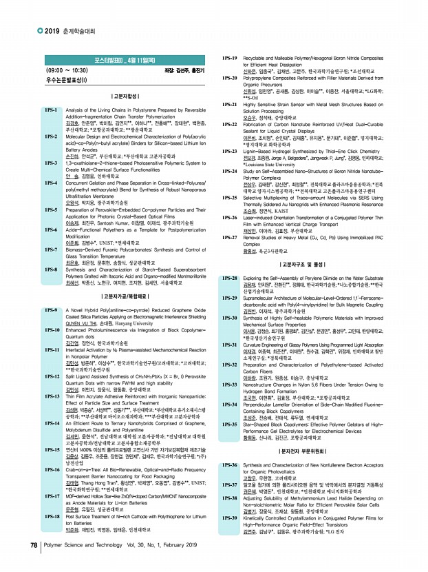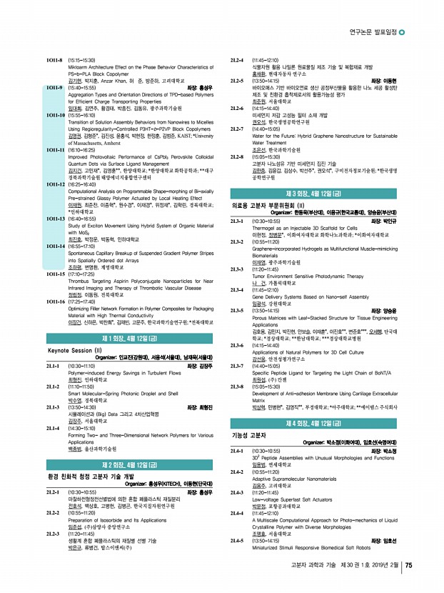 연구논문 발표일정 고분자 과학과 기술 제 30 권 1 호 2019년 2월 75 1O11-8 1515-1530 Miktoarm Architecture Effect on the Phase Behavior Characteristics of PS-b-PLA Block Copolymer 김기현, 박지훈, Anzar Khan, 허 준, 방준하, 고려대학교 1O11-9 1540-1555 좌장홍성우 Aggregation Types and Orientation Directions of TPD-based Polymers for Efficient Charge Transporting Properties 임대희, 김연주, 황경태, 박종진, 김동유, 광주과학기술원 1O11-10 1555-1610 Transition of Solution Assembly Behaviors from Nanowires to Micelles Using Regioregularity-Controlled P3HT-b-P2VP Block Copolymers 김영권, 김형준*, 김진성, 윤홍석, 박현정, 한정훈, 김범준, KAIST; *University of Massachusetts, Amherst 1O11-11 1610-1625 Improved Photovoltaic Performance of CsPbI3 Perovskite Colloidal Quantum Dots via Surface Ligand Management 김지건, 고민재*, 김영훈**, 한양대학교; *한양대학교 화학공학과; **대구 경북과학기...