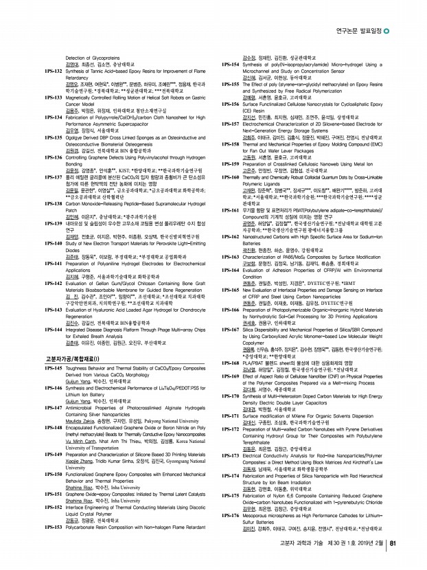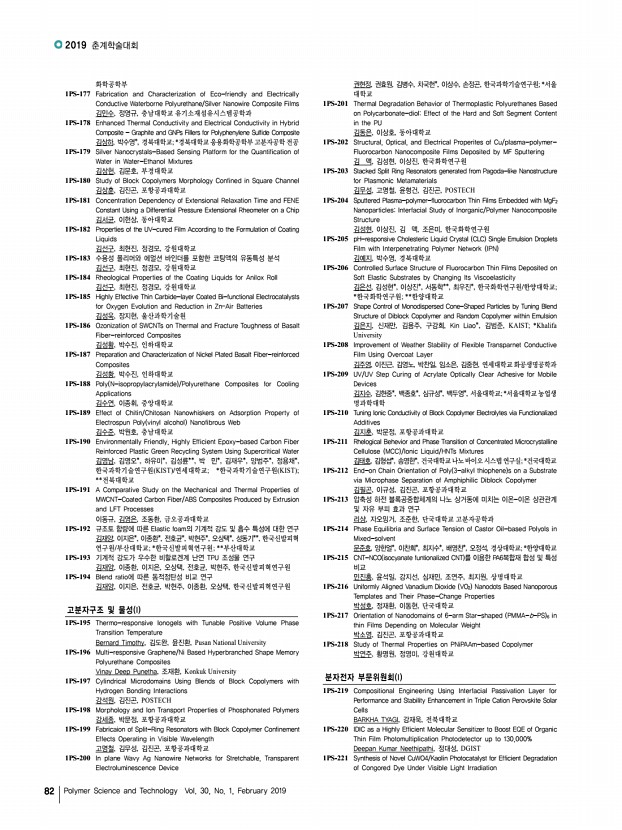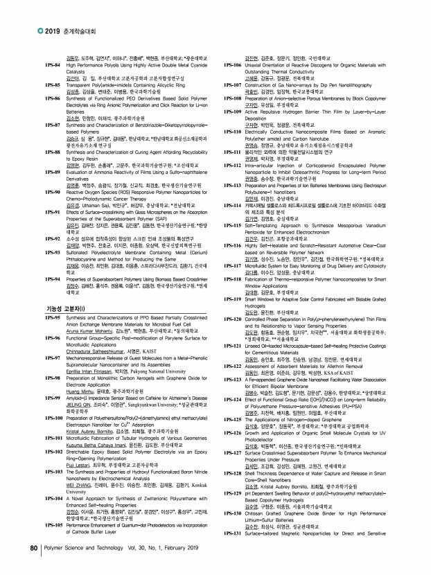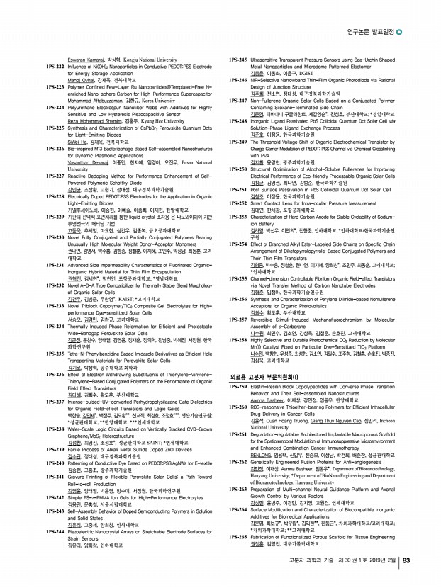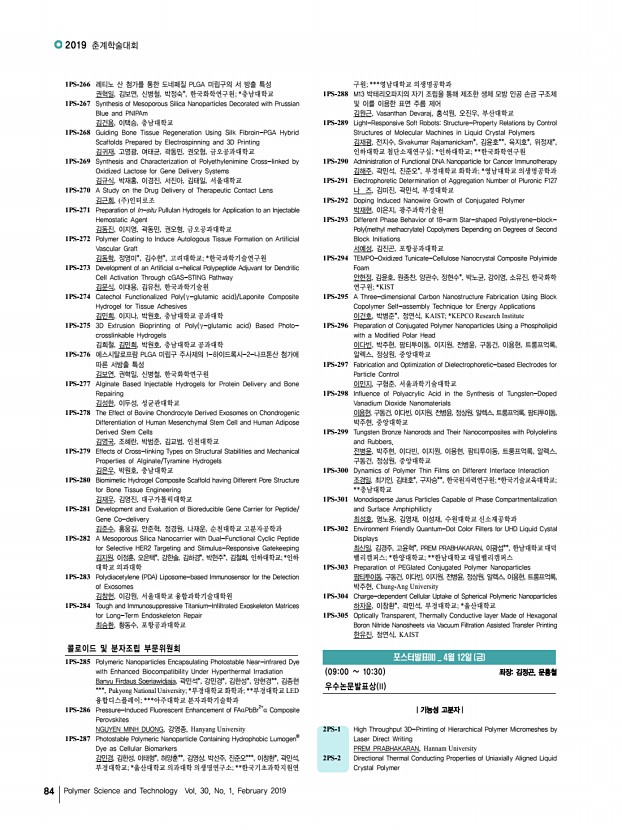 ...ne Delivery Systems 김규식, 박재홍, 이경진, 서진아, 김태일, 서울대학교 1PS-270 A Study on the Drug Delivery of Therapeutic Contact Lens 김근희, 주 인터로조 1PS-271 Preparation of In-situ Pullulan Hydrogels for Application to an Injectable Hemostatic Agent 김동진, 이지영, 곽동민, 권오형, 금오공과대학교 1PS-272 Polymer Coating to Induce Autologous Tissue Formation on Artificial Vascular Graft 김동학, 정영미*, 김수현*, 고려대학교; *한국과학기술연구원 1PS-273 Development of an Artificial α-helical Polypeptide Adjuvant for Dendritic Cell Activation Through cGAS-STING Pathway 김문식, 이대용, 김유천, 한국과학기술원 1PS-274 Catechol Functionalized Poly γ-glutamic acid /Laponite Composite Hydrogel for Tissue Adhesives 김민희, 이지나, 박원호, 충남대학교 공과대학 1PS-275 3D Extrusion Bioprinting of Poly γ-glutamic acid Based Photocrosslinkable Hydrogels 김희철, 김민희, 박원호, 충남...