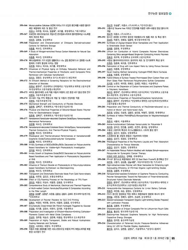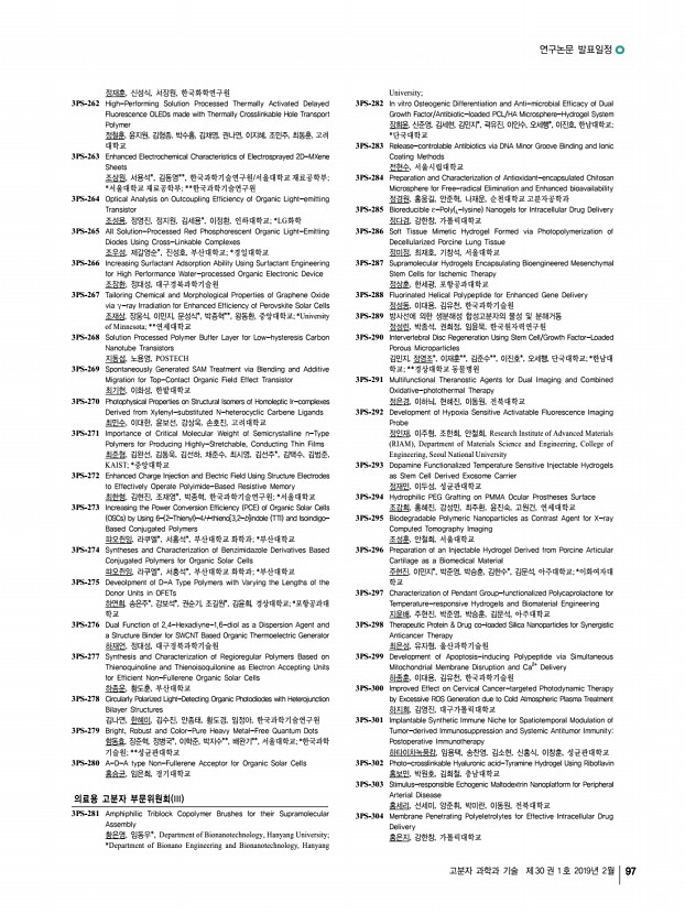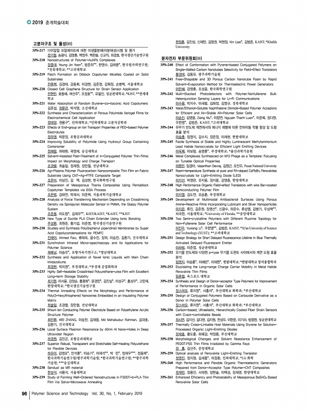 연구논문 발표일정 고분자 과학과 기술 제 30 권 1 호 2019년 2월 97 정재훈, 신성식, 서장원, 한국화학연구원 3PS-262 High-Performing Solution Processed Thermally Activated Delayed Fluorescence OLEDs made with Thermally Crosslinkable Hole Transport Polymer 정철훈, 윤지원, 김형종, 박수홍, 김채영, 권나연, 이지혜, 조민주, 최동훈, 고려 대학교 3PS-263 Enhanced Electrochemical Characteristics of Electrosprayed 2D-MXene Sheets 조상원, 서용석*, 김동영**, 한국과학기술연구원/서울대학교 재료공학부; *서울대학교 재료공학부; **한국과학기술연구원 3PS-264 Optical Analysis on Outcoupling Efficiency of Organic Light-emitting Transistor 조성용, 정영진, 정지원, 김세용*, 이정환, 인하대학교; *LG화학 3PS-265 All Solution-Processed Red Phosphorescent Organic Light-Emitting Diodes Using Cross-Linkable Complexes 조우섬, 제갈영순*, 진성호, 부산대학교; *경일대학교...