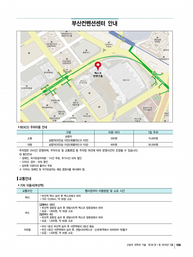 고분자 과학과 기술 제 30 권 1 호 2019년 2월 109 부산컨벤션센터 안내 ‣ BEXCO 주차이용 안내 구분 10분 마다 1일 주차 소형 승용차 승합자 25인승 미만 /화물차 2.5t 미만 300원 15,000원 대형 승합자 25인승 이상 /화물차 2.5t 이상 600원 30,000원 ·주차장은 24시간 운영하며, 주차수요 및 교통혼잡 등 주차장 여건에 따라 운영시간이 조정될 수 있습니다. ◎ 할인안내 장애인, 국가유공자차량 1시간 무료, 추가시간 50% 할인 다자녀, 경차 50% 할인 입차후 15분이내 출차시 무료 ※ 다자녀, 장애인 및 국가유공자는 해당 증명서를 제시해야 함. 교통안내 ‣ 기차 이용시 부산역 교통수단 행사장까지 이동방법 및 소요 시간 택시 ⦁부산역 택시 승차 후 벡스코에서 하차 ⦁거리 13.93km, 약 30분 소요 버스 [급행버스 1001] ⦁부산역 정류장 승차 후 센텀시티역 벡스코 정류장에서 ...