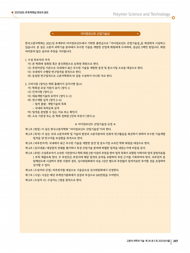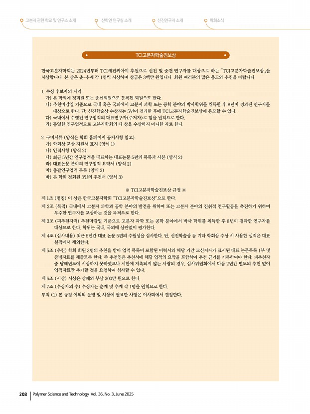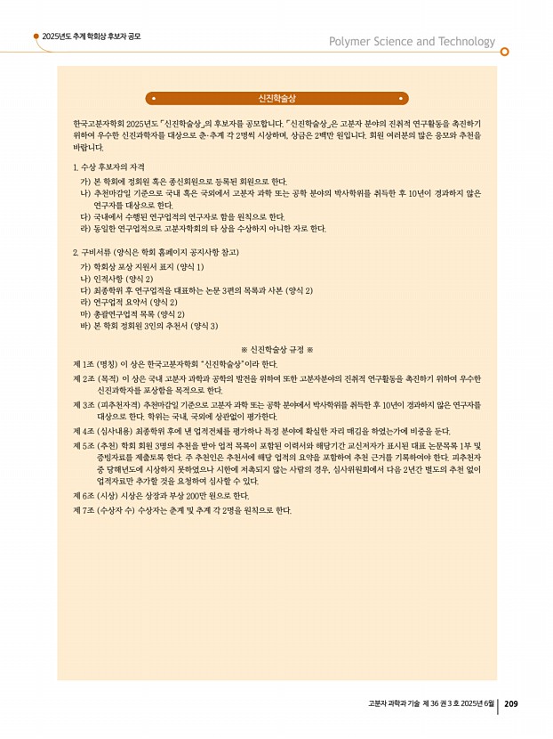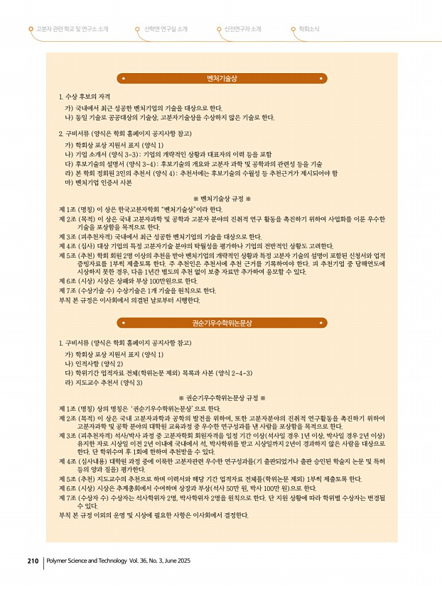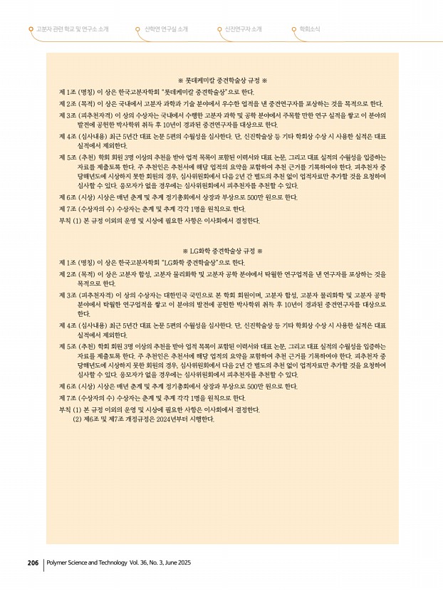고분자 관련 학교 및 연구소 소개 산학연 연구실 소개 신진연구자 소개 학회소식 206 Polymer Science and Technology Vol. 36, No. 3, June 2025 ※ 롯데케미칼 중견학술상 규정 ※ 제 1조 명칭 이 상은 한국고분자학회 “롯데케미칼 중견학술상”으로 한다. 제 2조 목적 이 상은 국내에서 고분자 과학과 기술 분야에서 우수한 업적을 낸 중견연구자를 포상하는 것을 목적으로 한다. 제 3조 피추천자격 이 상의 수상자는 국내에서 수행한 고분자 과학 및 공학 분야에서 주목할 만한 연구 실적을 쌓고 이 분야의 발전에 공헌한 박사학위 취득 후 10년이 경과된 중견연구자를 대상으로 한다. 제 4조 심사내용 최근 5년간 대표 논문 5편의 수월성을 심사한다. 단, 신진학술상 등 기타 학회상 수상 시 사용한 실적은 대표 실적에서 제외한다. 제 5조 추천 학회 회원 3명 이상의 추천을 ...