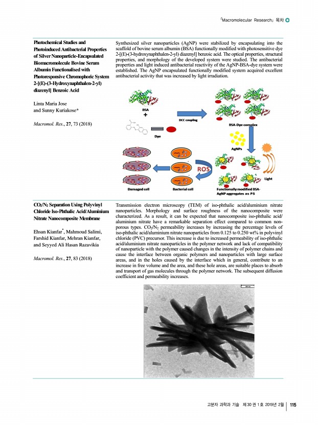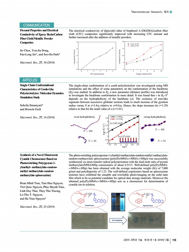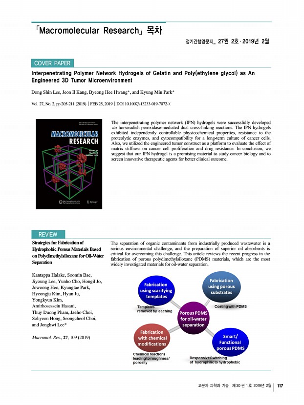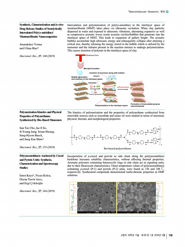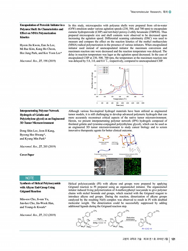 「Macromolecular Research」 목차 고분자 과학과 기술 제 30 권 1 호 2019년 2월 121 Encapsulation of Peroxide Initiator in a Polyurea ShellIts Characteristics and Effect on MMA Polymerization Kinetics Hyeon Jin Kwon, Eun Ju Lee, Mi Rae Kim, Kang Ho Cheon, Hee Jung Park, and Kee Yoon Lee* Macromol. Res., 27, 198 2019 In this study, microcapsules with polyurea shells were prepared from oil-in-water O/W emulsion under various agitation speeds 230, 500, and 700 rpm to encapsulate cumene hydroperoxide CHP and tert-butyl peroxy-2-ethly hexanoate TBPEH Thus prepared microcapsule size and shell contents were observed to be decreased upon increasing the agitation speed. Differential scanning calorimetry DSC was used to measure and compare the effect on the reaction kinetics of the methyl methacrylate MMA radical polymerization in the presence of various initiators. When encapsulated initiator used instead of unencapsulated initiator the maximum conversion and maximum reaction rate...
