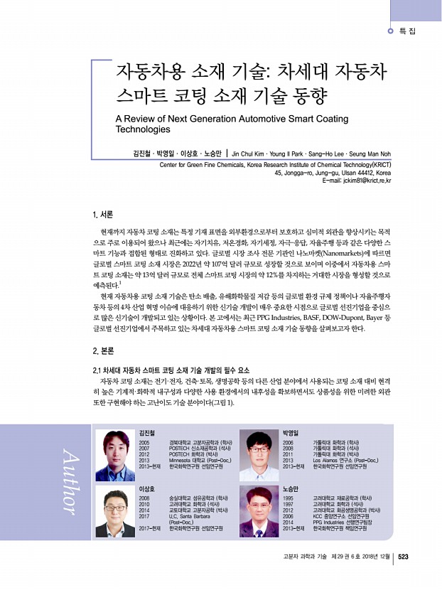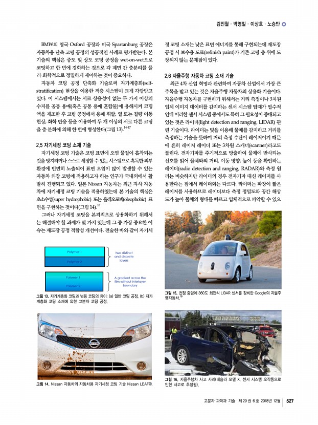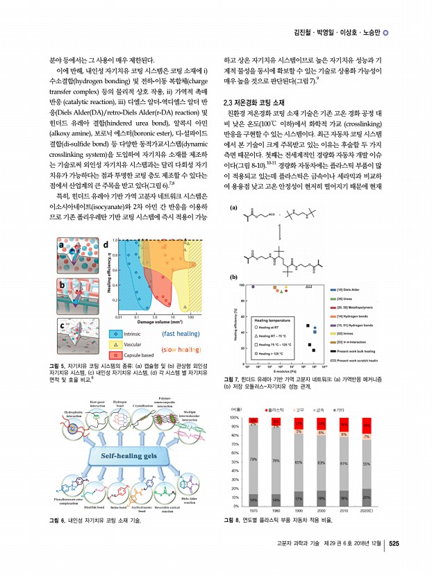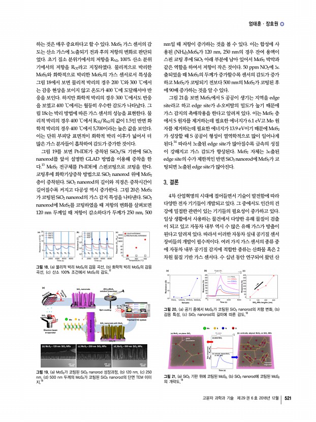 엄태훈ㆍ장호원 고분자 과학과 기술 제 29 권 6 호 2018년 12월 521 그림 20. a 공기 중에서 MoS2가 코팅된 SiO2 nanorod의 저항 변화, b 감응 특성, c SiO2 nanorod의 길이에 따른 감도.13 그림 21. a SiO2 기판 위에 코팅된 MoS2, b SiO2 nanorod에 코팅된 MoS2 의 개략도.13 그림 18. a 물리적 박리 MoS2의 감응 곡선, b 화학적 박리 MoS2의 감응 곡선, c 산소 100% 조건에서 MoS2의 감도.12 그림 19. a MoS2가 코팅된 SiO2 nanorod 성장과정, b 120 nm, c 250 nm, d 500 nm 두께의 MoS2가 코팅된 SiO2 nanorod의 단면 TEM 이미 지.13 하는 것은 매우 중요하다고 할 수 있다. MoS2 가스 센서의 감 도는 산소 가스에 노출되기 전과 후의 저항의 변화로 판단되 었다. 초기 질소 분위기에서의 저항을 RN2, 100% 산소 분위 기에서의 저항을 RO2라고 지칭하였다. 물리적으로 박리한 MoS2와 화학적으로 박리한 MoS2의 가스 센서로서 특성...