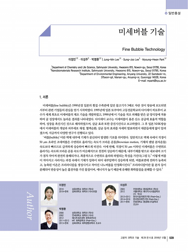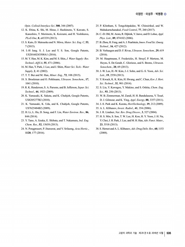 이정민ㆍ이성주ㆍ박명환 고분자 과학과 기술 제 29 권 6 호 2018년 12월 535 Opin. Colloid Interface Sci. 308, 344 2007 12. K. Ebina, K. Shi, M. Hirao, J. Hashimoto, Y. Kawato, S. Kaneshiro, T. Morimoto, K. Koizumi, and H. Yoshikawa, PLoS One, 8, e65339 2013 13. S. Kato, D. Matsuoka and N. Miwa, Mater. Sci. Eng. C, 53, 7 2015 14. I.-H Jung. S. J. Lee and Y. S. Son, Google Patents, US20160243508A1 2016 15. M. Y. Han, M. K. Kim, and M. S. Shin, J. Water SupplyRes. Technol.-AQUA, 55, 471 2006 16. M. Han, Y. Park, J. Lee, and J. Shim, Water Sci. Tech.- Water Supply, 2, 41 2002 17. T. T. Bui and M. Han, Miner. Eng., 72, 108 2015 18. S. Broekman and O. Pohlmann, Ultrason. Sonochem., 17, 1041 2010 19. R. K. Henderson, S. A. Parsons, and B. Jefferson, Separ. Sci. Technol., 44, 1923 2009 20. K. Yamasaki, K. Sakata, and K. Chuhjoh, Google Patents, US8205277B2 2010 21. K. Yamasaki, K. Uda, and K. Chuhjoh, Google Patents, US7625484B2 2009 22. H. Li, L. Hu, D. Song, and F. Lin, W...