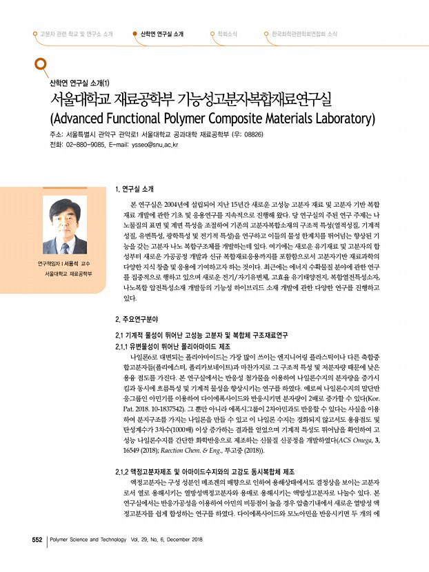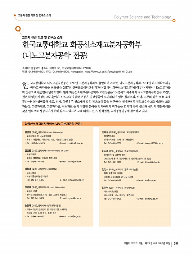 고분자 과학과 기술 제 29 권 6 호 2018년 12월 551 한 고분자 관련 학교 및 연구소 소개 한국교통대학교 화공신소재고분자공학부 나노고분자공학 전공 소재지충청북도 충주시 대학로 50, 한국교통대학교 우27469 전화043-841-5421, FAX043-841-5420, Homepagehttps//www.ut.ac.kr/cme/sub04_01_01.do 국교통대학교 나노고분자전공은 1996년 고분자공학과로 출발하여 2007년 나노고분자공학과, 2014년 나노화학소재공 학과로 학과명을 변경했다. 2017년 한국교통대의 3개 학과가 합쳐서 화공신소재고분자공학부가 되면서 나노고분자공 학 전공으로 전공명이 변경되었다. 현재 화공신소재고분자공학부 모집정원은 164명이고 이중에서 나노고분자공학전공 모집인 원은 57명 편제정원 237명 이다. 나노고분자공학 전공은 일상생활에 보편화되어 있는 플라스틱, 비닐, 고무와 같은 범용 소재 뿐...
