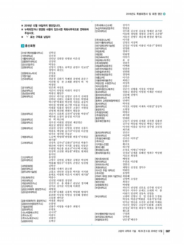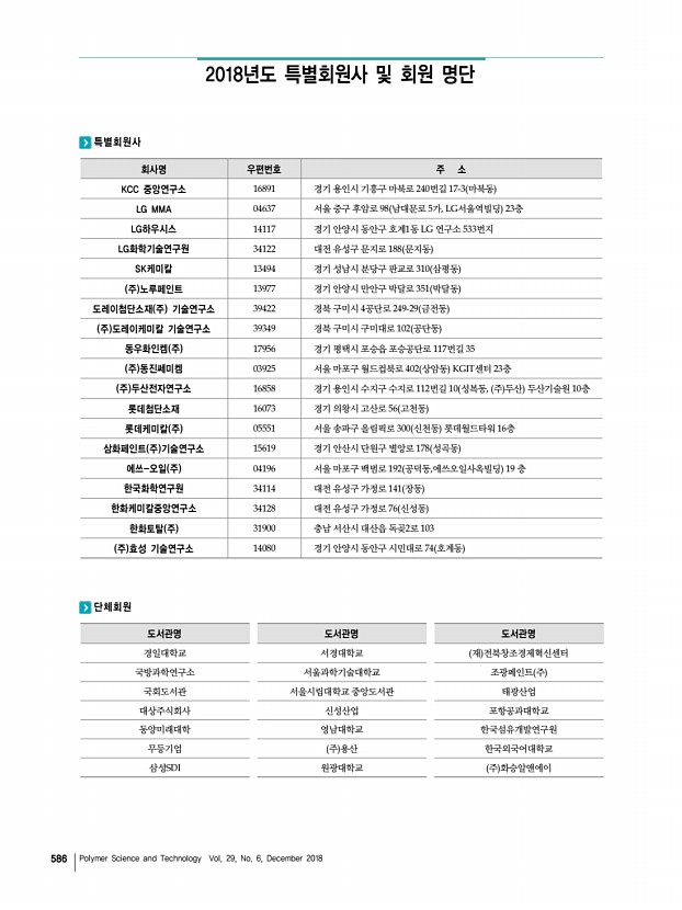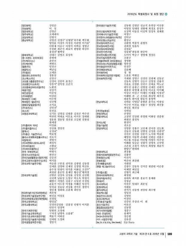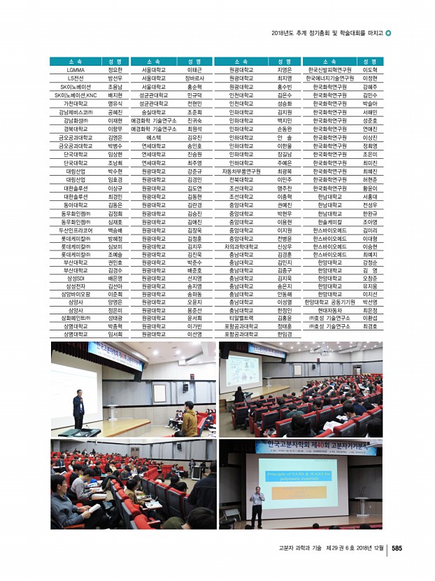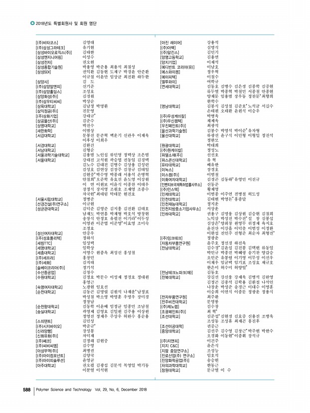 2018년도 추계 정기총회 및 학술대회를 마치고 고분자 과학과 기술 제 29 권 6 호 2018년 12월 585 소 속 성 명 소 속 성 명 소 속 성 명 소 속 성 명 LGMMA 정요한 서울대학교 이태근 원광대학교 지영은 한국신발피혁연구원 이도혁 LS전선 방선우 서울대학교 장바르사 원광대학교 최지영 한국에너지기술연구원 이정현 SK이노베이션 조용남 서울대학교 홍순혁 원광대학교 홍수빈 한국화학연구원 강혜주 SK이노베이션,KNC 배지현 성균관대학교 민규덕 인천대학교 김은수 한국화학연구원 김민수 가천대학교 명유식 성균관대학교 전현민 인천대학교 성승화 한국화학연구원 박슬아 강남제비스코㈜ 공혜진 숭실대학교 조준희 인하대학교 김지원 한국화학연구원 서해민 강남화성㈜ 이재현 애경화학 기술연구소 진귀숙 인하대학교 백지민 한국화학연구원 성준호 경북대...