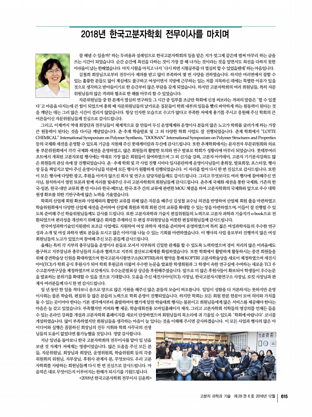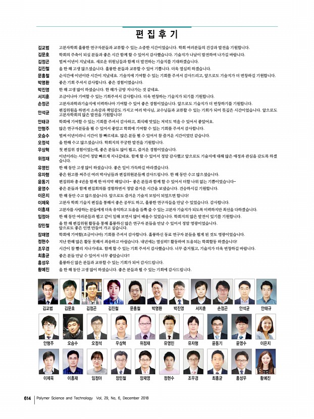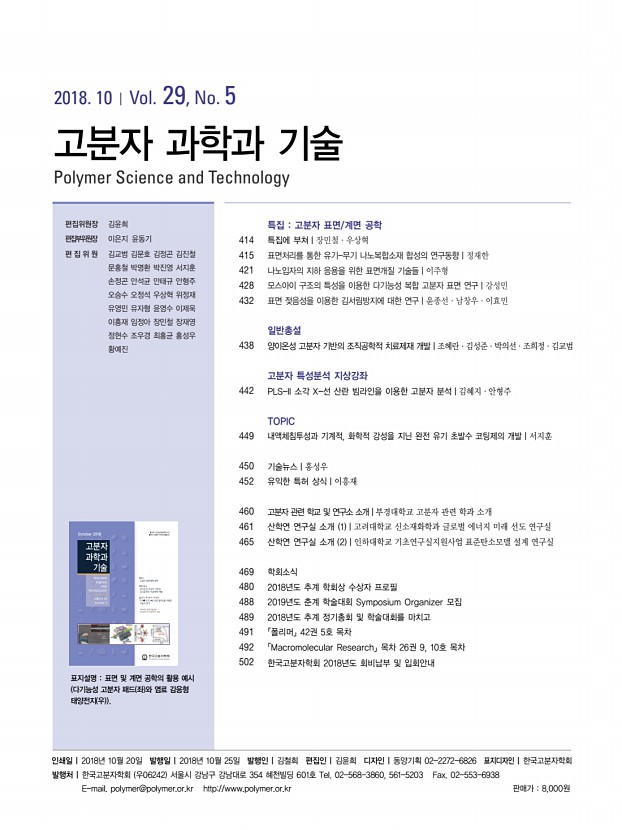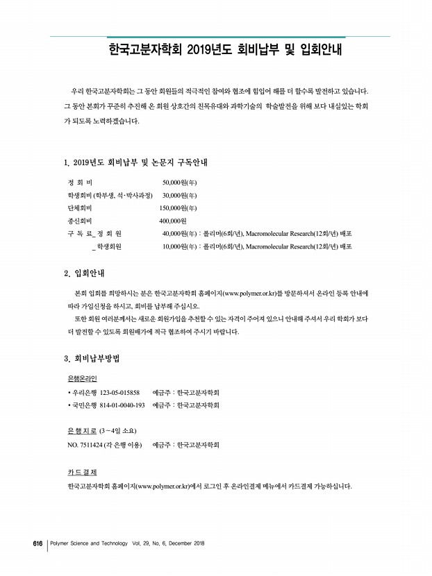 616 Polymer Science and Technology Vol. 29, No. 6, December 2018 한국고분자학회 2019년도 회비납부 및 입회안내 우리 한국고분자학회는 그 동안 회원들의 적극적인 참여와 협조에 힘입어 해를 더 할수록 발전하고 있습니다. 그 동안 본회가 꾸준히 추진해 온 회원 상호간의 친목유대와 과학기술의 학술발전을 위해 보다 내실있는 학회 가 되도록 노력하겠습니다. 1. 2019년도 회비납부 및 논문지 구독안내 정 회 비 50,000원 年 학생회비 학부생, 석・박사과정 30,000원 年 단체회비 150,000원 年 종신회비 400,000원 구 독 료_ 정 회 원 40,000원 年 :폴리머 6회/년 , Macromolecular Research 12회/년 배포 _ 학생회원 10,000원 年 :폴리머 6회/년 , Macromolecular Research 12회/년 배포 2. 입회안내 본회 입회를 희망하시는 분은 한국고분자학회 홈페이지 www.polymer.or.kr 를 방문하셔서 온라인 등록 안내...