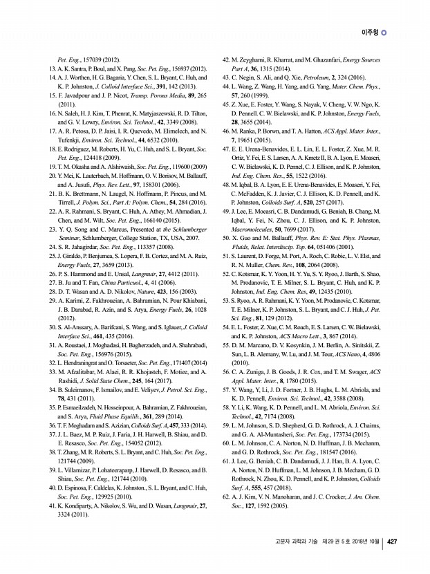 이주형 고분자 과학과 기술 제 29 권 5 호 2018년 10월 427 Pet. Eng., 157039 2012 13. A. K. Santra, P. Boul, and X. Pang, Soc. Pet. Eng., 156937 2012 14. A. J. Worthen, H. G. Bagaria, Y. Chen, S. L. Bryant, C. Huh, and K. P. Johnston, J. Colloid Interface Sci., 391, 142 2013 15. F. Javadpour and J. P. Nicot, Transp. Porous Media, 89, 265 2011 16. N. Saleh, H. J. Kim, T. Phenrat, K. Matyjaszewski, R. D. Tilton, and G. V. Lowry, Environ. Sci. Technol., 42, 3349 2008 17. A. R. Petosa, D. P. Jaisi, I. R. Quevedo, M. Elimelech, and N. Tufenkji, Environ. Sci. Technol., 44, 6532 2010 18. E. Rodriguez, M. Roberts, H. Yu, C. Huh, and S. L. Bryant, Soc. Pet. Eng., 124418 2009 19. T. M. Okasha and A. Alshiwaish, Soc. Pet. Eng., 119600 2009 20. Y. Mei, K. Lauterbach, M. Hoffmann, O. V. Borisov, M. Ballauff, and A. Jusufi, Phys. Rev. Lett., 97, 158301 2006 21. B. K. Brettmann, N. Laugel, N. Hoffmann, P. Pincus, and M. Tirrell, J. Polym. Sci., Part APolym. Chem., 54, 284 2016 22. A. R. ...