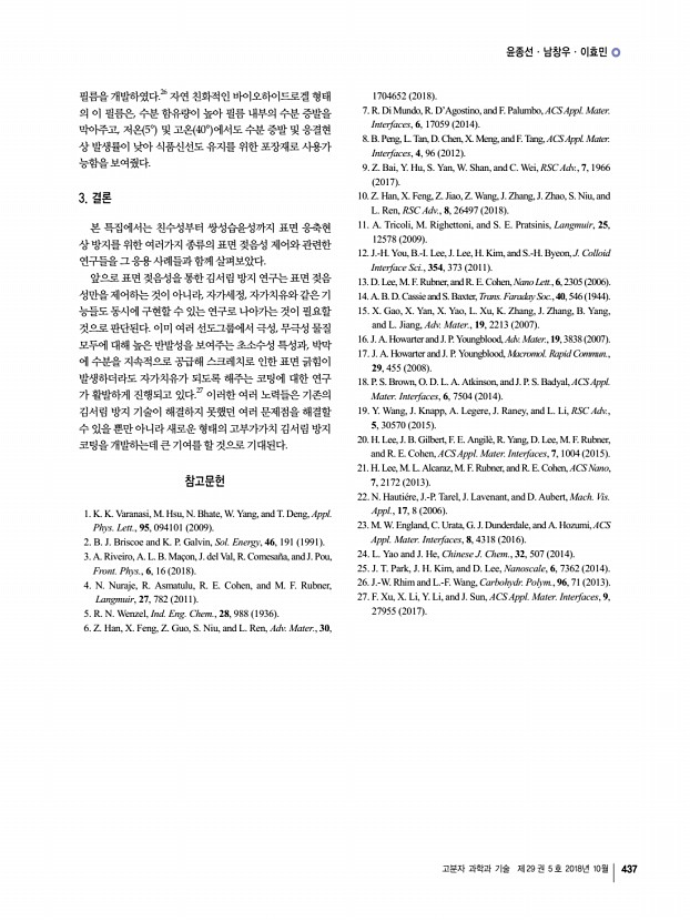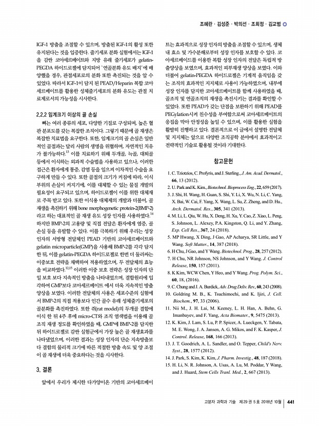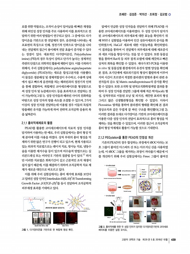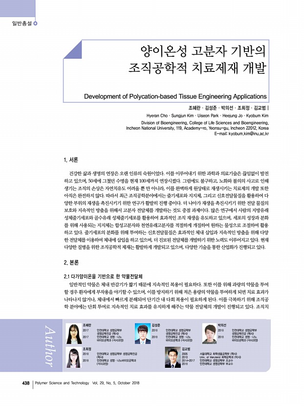 ... 치료제재 개발 Development of Polycation-based Tissue Engineering Applications 조혜란ㆍ김성준ㆍ박의선ㆍ조희정ㆍ김교범 | Hyeran ChoㆍSungjun KimㆍUiseon ParkㆍHeejung JoㆍKyobum Kim Division of Bioengineering, College of Life Sciences and Bioengineering, Incheon National University, 119, Academy-ro, Yeonsu-gu, Incheon 22012, Korea E-mailkyobum.kim@inu.ac.kr 1. 서론 건강한 삶과 생명의 연장은 오랜 인류의 숙원이었다. 이를 이루어내기 위한 과학과 의료기술은 끊임없이 발전 하고 있으며, 50세에 그쳤던 수명을 현재 100세까지 연장시켰다. 그럼에도 불구하고, 노화와 불의의 사고로 인해 생기는 조직의 손상은 자연치유도 어려울 뿐 만 아니라, 이를 완벽하게 원상태로 재생시키는 치료제의 개발 또한 아직은 완전하지 않다. 따라서 최근 조직공학분야에서는 줄기세포와 지지체, 그리고 신호전달물질을 활용하여 다 양...