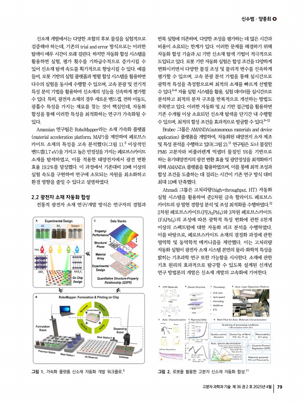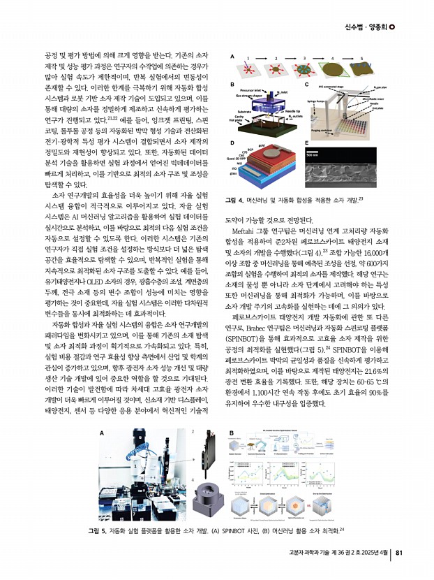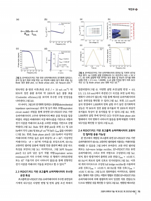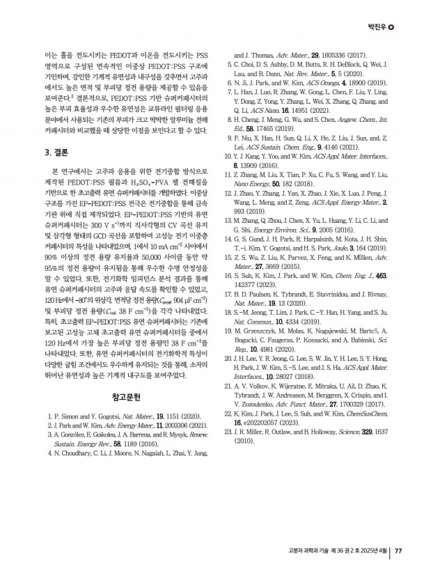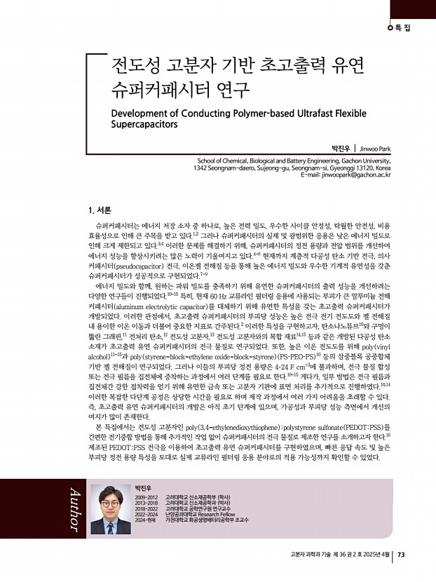 특 집 고분자 과학과 기술 제 36 권 2 호 2025년 4월 73 1. 서론 슈퍼커패시터는 에너지 저장 소자 중 하나로, 높은 전력 밀도, 우수한 사이클 안정성, 탁월한 안전성, 비용 효율성으로 인해 큰 주목을 받고 있다.1,2 그러나 슈퍼커패시터의 실제 및 광범위한 응용은 낮은 에너지 밀도로 인해 크게 제한되고 있다.3,4 이러한 문제를 해결하기 위해, 슈퍼커패시터의 정전 용량과 전압 범위를 개선하여 에너지 성능을 향상시키려는 많은 노력이 기울여지고 있다.4-6 현재까지 계층적 다공성 탄소 기반 전극, 의사 커패시터 pseudocapacitor 전극, 이온젤 전해질 등을 통해 높은 에너지 밀도와 우수한 기계적 유연성을 갖춘 슈퍼커패시터가 성공적으로 구현되었다.7-9 에너지 밀도와 함께, 원하는 파워 밀도를 충족하기 위해 유연한 슈퍼커패시터의 출력 성능을 개선하려는 다...