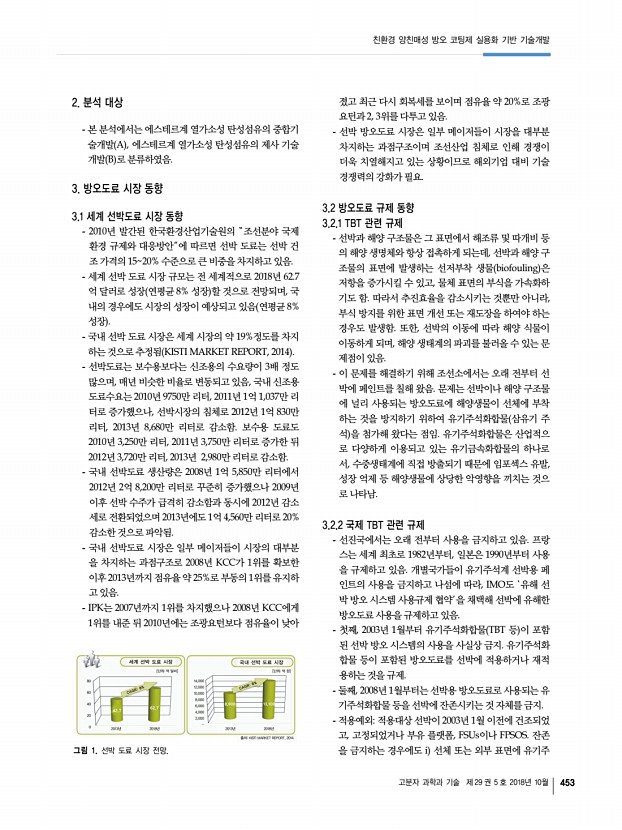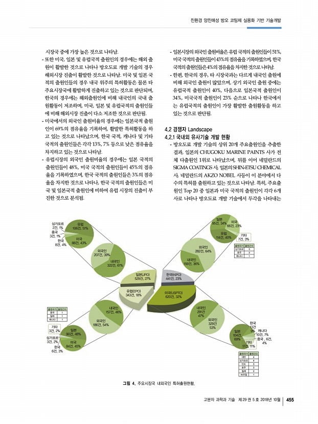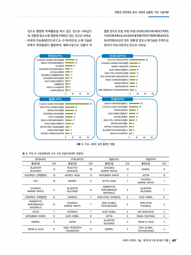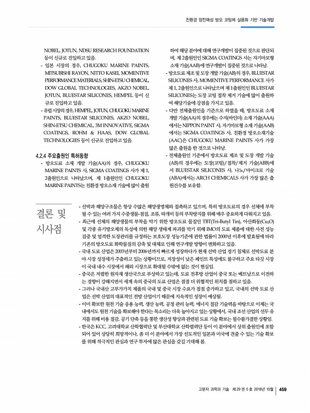 친환경 양친매성 방오 코팅제 실용화 기반 기술개발 고분자 과학과 기술 제 29 권 5 호 2018년 10월 459 결론 및 시사점 NOBEL, JOTUN, NDSU RESEARCH FOUNDATION 등이 신규로 진입하고 있음. 일본 시장의 경우, CHUGOKU MARINE PAINTS, MITSUBISHI RAYON, NITTO KASEI, MOMENTIVE PERFORMANCE MATERIALS, SHIN-ETSU CHEMICAL, DOW GLOBAL TECHNOLOGIES, AKZO NOBEL, JOTUN, BLUESTAR SILICONES, HEMPEL 등이 신 규로 진입하고 있음. 유럽 시장의 경우, HEMPEL, JOTUN, CHUGOKU MARINE PAINTS, BLUESTAR SILICONES, AKZO NOBEL, SHIN-ETSU CHEMICAL, 3M INNOVATIVE, SIGMA COATINGS, ROHM & HAAS, DOW GLOBAL TECHNOLOGIES 등이 신규로 진입하고 있음. 4.2.4 주요출원인 특허동향 방오도료 소재 개발 기술 AA 의 경우, CHUGOKU MARINE PAINTS 사, SIGMA COATINGS 사가 제 1, 2출원인으로 나타났으며, 제 1출원인인 CHUGOKU MARINE PAINTS는 친환경 방오소재 기술에 많이 출원 하여 해당 분야에 대해 연구개발...
