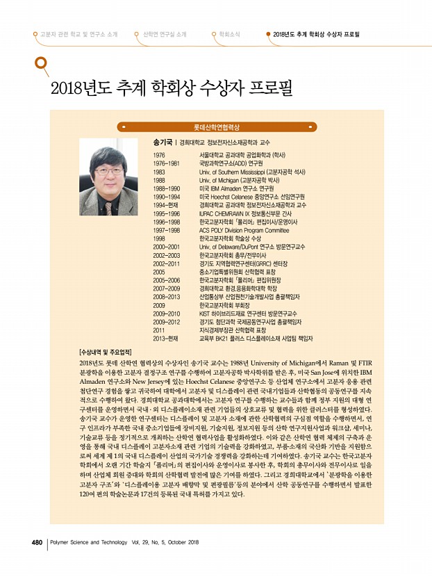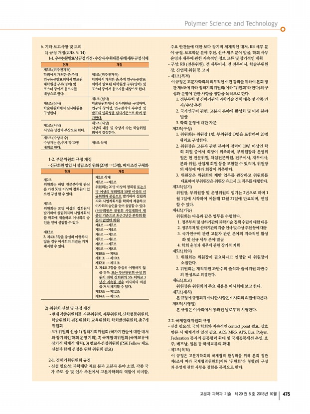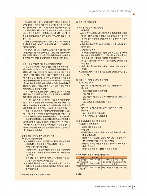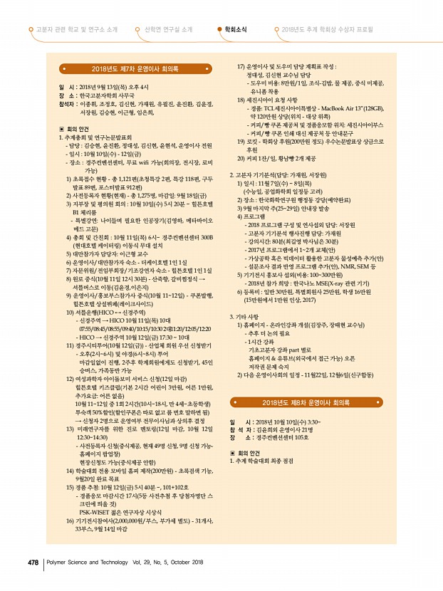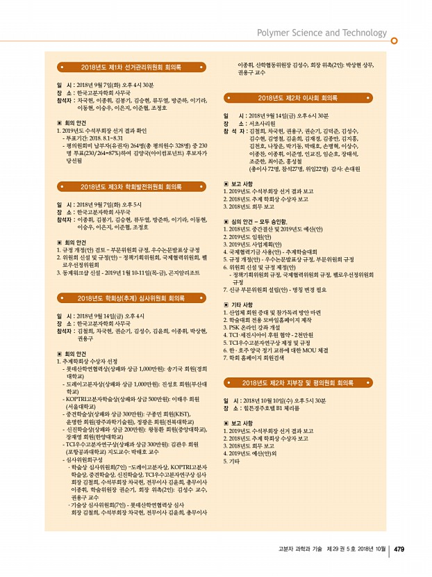 고분자 과학과 기술 제 29 권 5 호 2018년 10월 479 2018년도 제1차 선거관리위원회 회의록 일 시 2018년 9월 7일 화 오후 4시 30분 장 소 한국고분자학회 사무국 참석자 차국헌, 이종휘, 김봉기, 김승현, 류두열, 방준하, 이기라, 이동현, 이숭우, 이은지, 이준협, 조정호 ▣ 회의 안건 1. 2019년도 수석부회장 선거 결과 확인 투표기간2018. 8.18.31 평의원회비 납부자 유권자 264명 총 평의원수 328명 중 230 명 투표 230/264=87% 하여 김양국 아이컴포넌트 후보자가 당선됨 2018년도 제3차 학회발전위원회 회의록 일 시 2018년 9월 7일 화 오후 5시 장 소 한국고분자학회 사무국 참석자 이종휘, 김봉기, 김승현, 류두열, 방준하, 이기라, 이동현, 이숭우, 이은지, 이준협, 조정호 ▣ 회의 안건 1. 규정 개정 안 검토 – 부문위원회 규정, 우수논문발표상 규정 2. 위원회 신설 및 규정 안 – ...