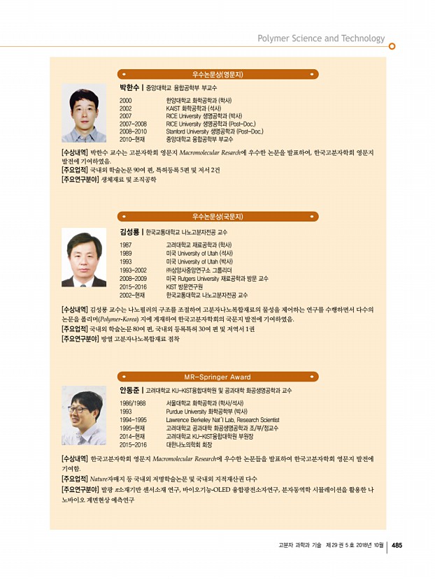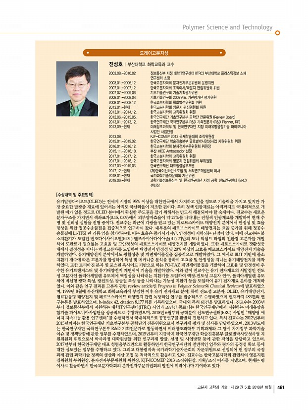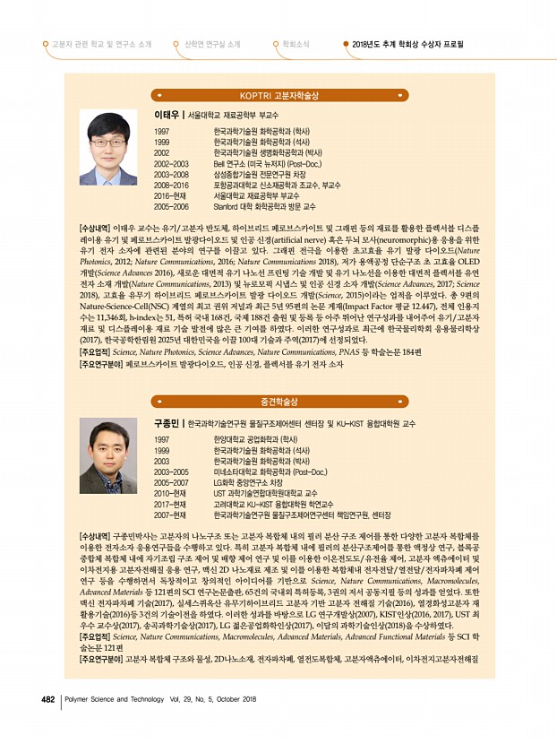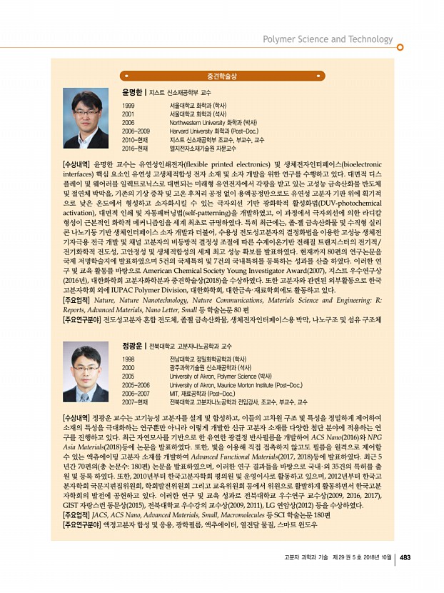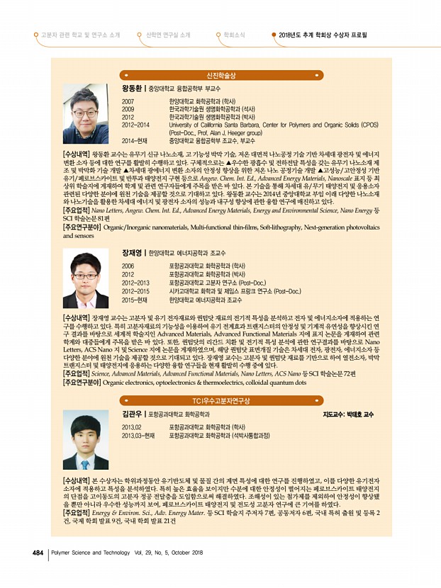 고분자 관련 학교 및 연구소 소개 산학연 연구실 소개 학회소식 2018년도 추계 학회상 수상자 프로필 484 Polymer Science and Technology Vol. 29, No. 5, October 2018 신진학술상 왕동환|중앙대학교 융합공학부 부교수 2007 한양대학교 화학공학과 학사 2009 한국과학기술원 생명화학공학과 석사 2012 한국과학기술원 생명화학공학과 박사 2012-2014 University of California Santa Barbara, Center for Polymers and Organic Solids CPOS Post-Doc., Prof. Alan J. Heeger group 2014-현재 중앙대학교 융합공학부 조교수, 부교수 [수상내역] 왕동환 교수는 유무기 신규 나노소재, 고 기능성 박막 기술, 저온 대면적 나노공정 기술 기반 차세대 광전자 및 에너지 변환 소자 등에 대한 연구를 활발히 수행하고 있다. 구체적으로는 ▲우수한 광흡수 및 전하전달 특성을 갖는 유무기 나노소재 제 조 및 박막화 기술 개발 ▲...