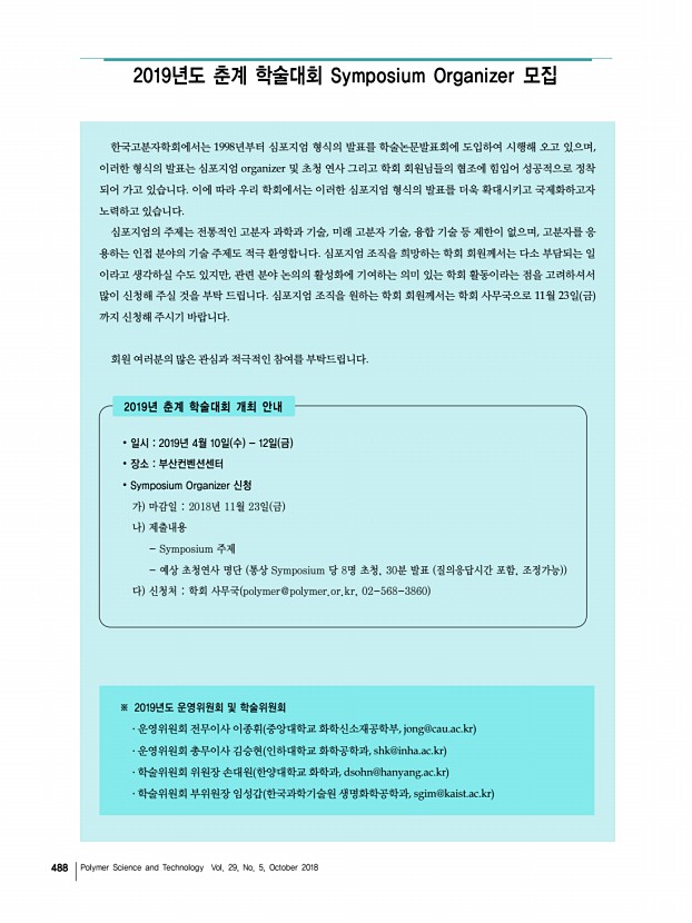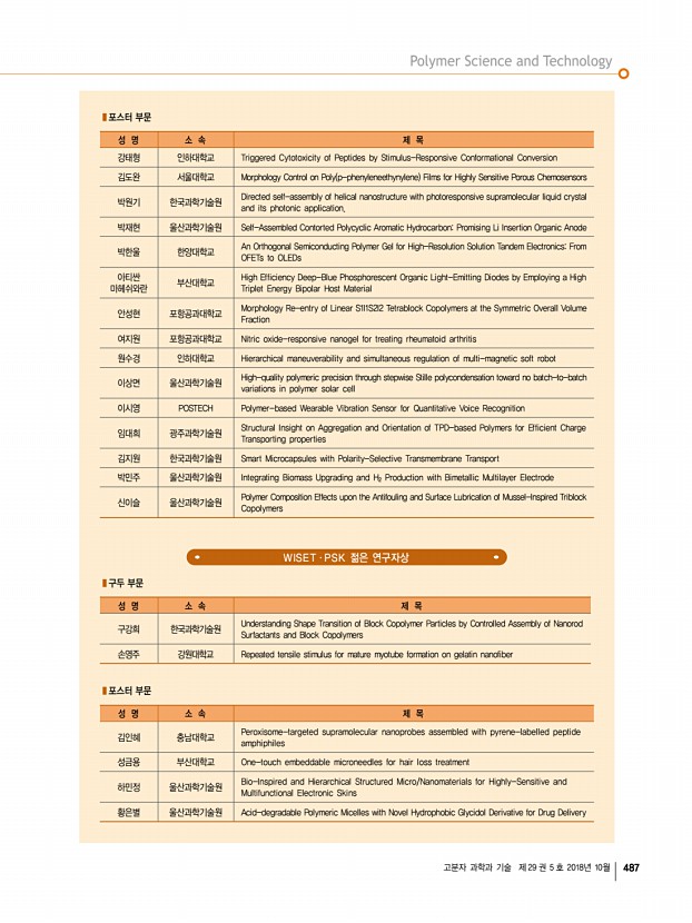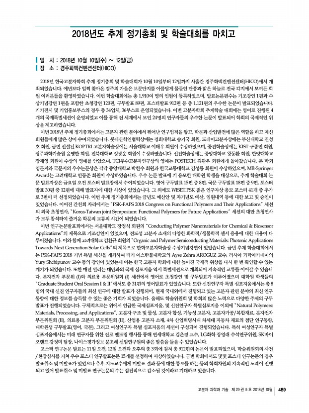 고분자 과학과 기술 제 29 권 5 호 2018년 10월 489 2018년도 추계 정기총회 및 학술대회를 마치고 일 시 2018년 10월 10일 수 12일 금 장 소 경주화백컨벤션센터 HICO 2018년 한국고분자학회 추계 정기총회 및 학술대회가 10월 10일부터 12일까지 사흘간 경주화백컨벤션센터 HICO 에서 개 최되었습니다. 예년보다 일찍 찾아온 경주의 가을은 보문단지를 아름답게 물들인 단풍과 맑은 하늘로 전국 각지에서 모여든 회 원 여러분들을 환영하였습니다. 이번 학술대회에는 총 1,910여 명의 인원이 등록하였으며, 발표논문편수는 기조강연 1편과 수 상기념강연 1편을 포함한 초청강연 120편, 구두발표 89편, 포스터발표 912편 등 총 1,121편의 우수한 논문이 발표되었습니다. 기기전시 및 기업홍보부스의 경우 총 34업체, 36부스로 운영되었습니다. 이번 고분자학회 추계학술 대회에는...