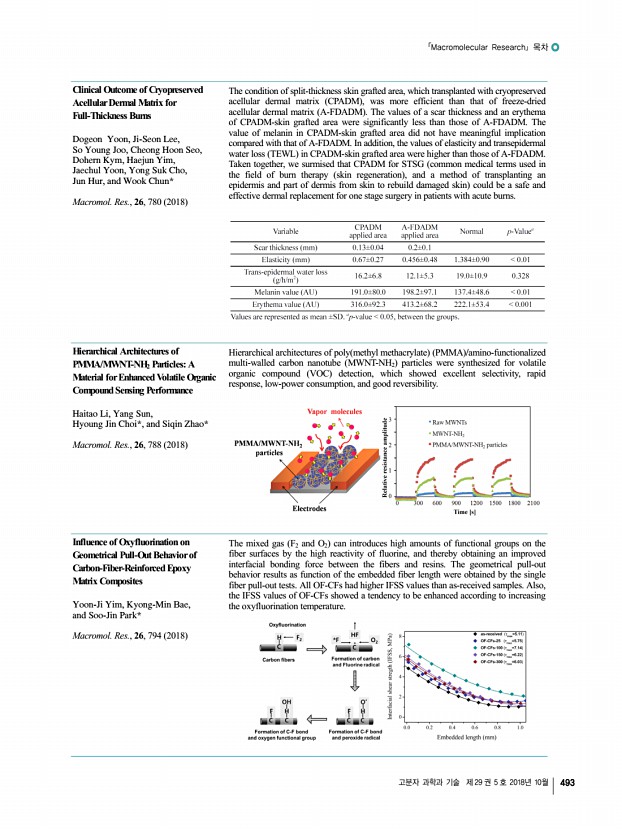 「Macromolecular Research」 목차 고분자 과학과 기술 제 29 권 5 호 2018년 10월 493 Clinical Outcome of Cryopreserved Acellular Dermal Matrix for Full-Thickness Burns Dogeon Yoon, Ji-Seon Lee, So Young Joo, Cheong Hoon Seo, Dohern Kym, Haejun Yim, Jaechul Yoon, Yong Suk Cho, Jun Hur, and Wook Chun* Macromol. Res., 26, 780 2018 The condition of split-thickness skin grafted area, which transplanted with cryopreserved acellular dermal matrix CPADM , was more efficient than that of freeze-dried acellular dermal matrix A-FDADM The values of a scar thickness and an erythema of CPADM-skin grafted area were significantly less than those of A-FDADM. The value of melanin in CPADM-skin grafted area did not have meaningful implication compared with that of A-FDADM. In addition, the values of elasticity and transepidermal water loss TEWL in CPADM-skin grafted area were higher than those of A-FDADM. Taken together, we surmised that CPADM for STSG common medical terms used in the field...
