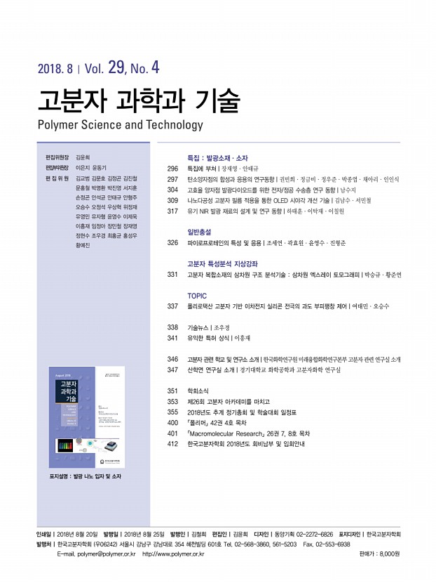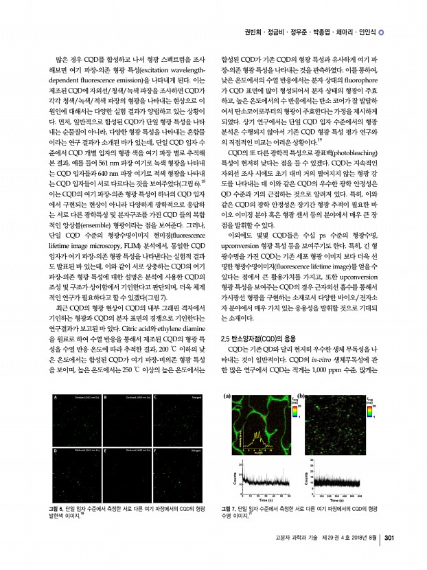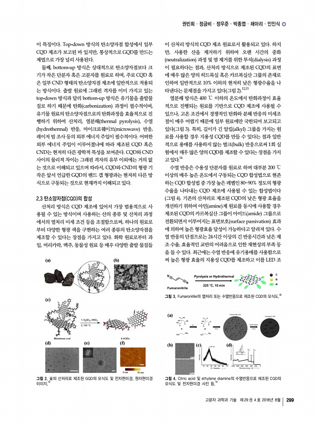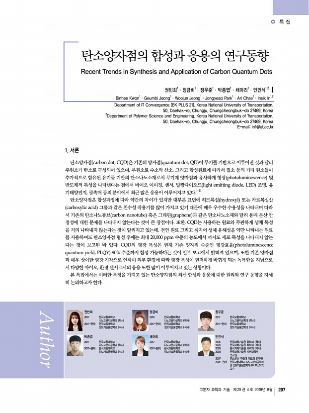 특 집 고분자 과학과 기술 제 29 권 4 호 2018년 8월 297 탄소양자점의 합성과 응용의 연구동향 Recent Trends in Synthesis and Application of Carbon Quantum Dots 권빈희1ㆍ정금비1ㆍ정우준1ㆍ박종엽1ㆍ채아리1ㆍ인인식1,2 | Binhee Kwon1ㆍGeumbi Jeong1ㆍWoojun Jeong1ㆍJongyeap Park1ㆍAri Chae1ㆍInsik In1,2 1Department of IT Convergence BK PLUS 21 , Korea National University of Transportation, 50, Daehak-ro, Chungju, Chungcheongbuk-do 27469, Korea 2 Department of Polymer Science and Engineering, Korea National University of Transportation, 50, Daehak-ro, Chungju, Chungcheongbuk-do 27469, Korea E-mailin1@ut.ac.kr 권빈희 2017 한국교통대학교 나노고분자공학과 학사 2017-현재 한국교통대학교 정보기술융합학과 석사 정금비 2015 한국교통대학교 나노고분자공학과 학사 2017-현재 한국교통대학교 정보기술융합학과 석사 정우준 2017 한국교통대학교 나노고분자공학과 ...