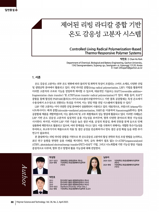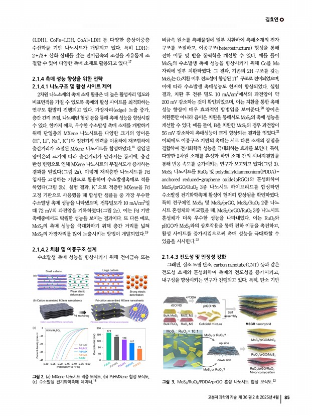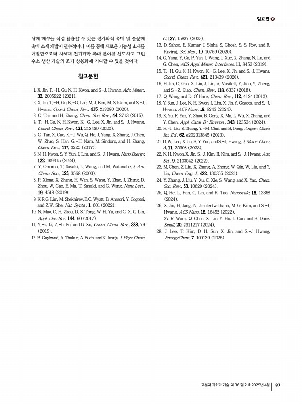 김효연 고분자 과학과 기술 제 36 권 2 호 2025년 4월 87 위해 해수를 직접 활용할 수 있는 전기화학 촉매 및 물분해 촉매 소재 개발이 필수적이다. 이를 통해 새로운 기능성 소재를 개발함으로써 차세대 전기화학 촉매 분야를 선도하고 그린 수소 생산 기술의 조기 상용화에 기여할 수 있을 것이다. 참고문헌 1. X. Jin, T.-H. Gu, N. H. Kwon, and S.-J. Hwang, Adv. Mater., 33, 2005922 2021 2. X. Jin, T.-H. Gu, K.-G. Lee, M. J. Kim, M. S. Islam, and S.-J. Hwang, Coord. Chem. Rev., 415, 213280 2020 3. C. Tan and H. Zhang, Chem. Soc. Rev., 44, 2713 2015 4. T.-H. Gu, N. H. Kwon, K.-G. Lee, X. Jin, and S.-J. Hwang, Coord. Chem. Rev., 421, 213439 2020 5. C. Tan, X. Cao, X.-J. Wu, Q. He, J. Yang, X. Zhang, J. Chen, W. Zhao, S. Han, G.-H. Nam, M. Sindoro, and H. Zhang, Chem. Rev., 117, 6225 2017 6. N. H. Kwon, S. Y. Yun, J. Lim, and S.-J. Hwang, Nano Energy, 122, 109315 2024 7. Y. Omomo, T. Sasaki, L. Wang...