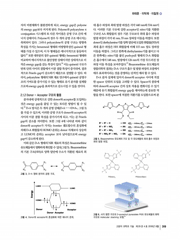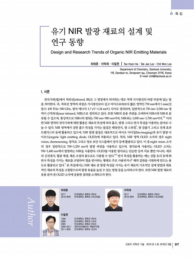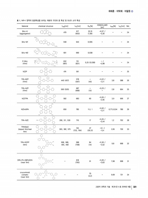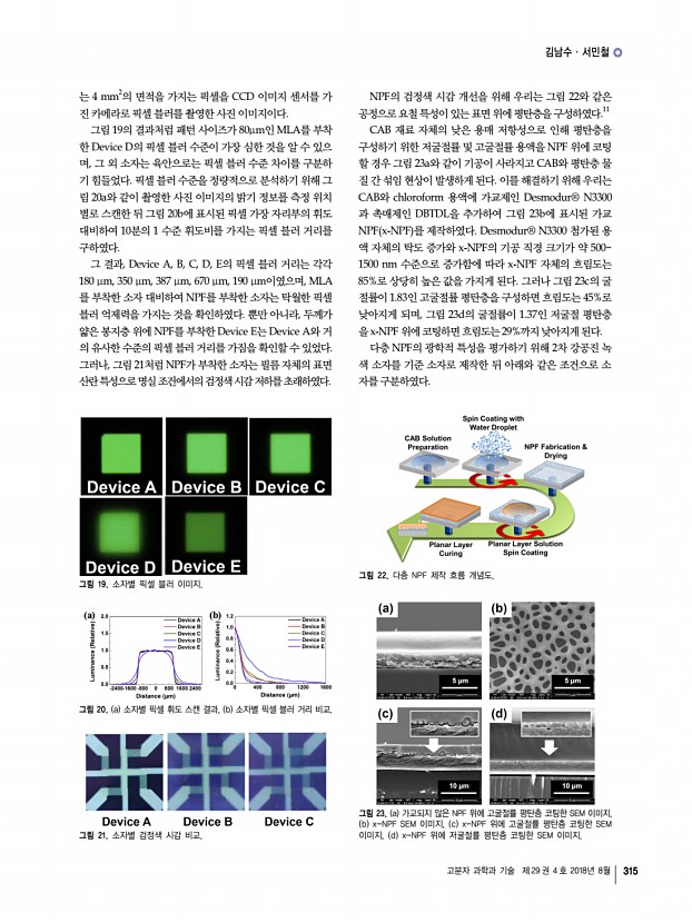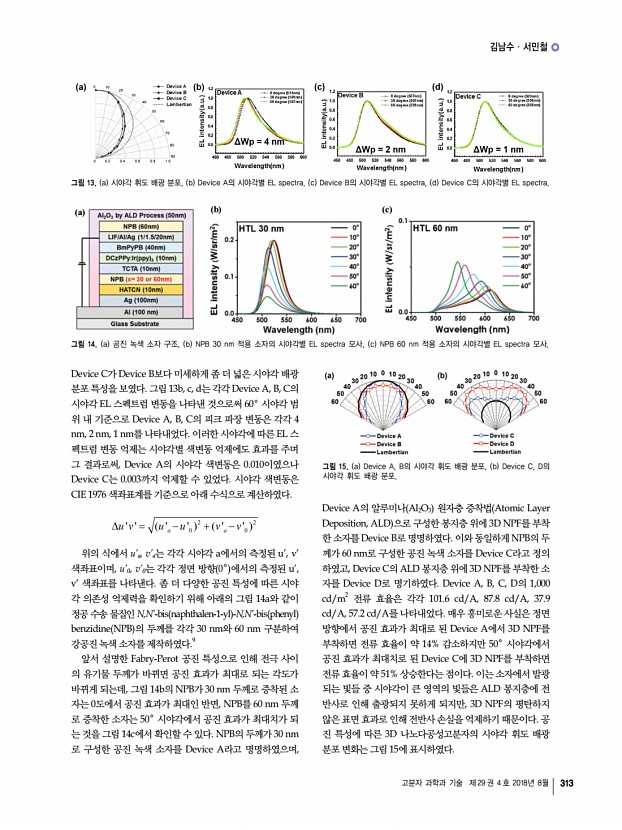 김남수ㆍ서민철 고분자 과학과 기술 제 29 권 4 호 2018년 8월 313 그림 13. a 시야각 휘도 배광 분포, b Device A의 시야각별 EL spectra, c Device B의 시야각별 EL spectra, d Device C의 시야각별 EL spectra. a b c 그림 14. a 공진 녹색 소자 구조, b NPB 30 nm 적용 소자의 시야각별 EL spectra 모사, c NPB 60 nm 적용 소자의 시야각별 EL spectra 모사. 그림 15. a Device A, B의 시야각 휘도 배광 분포, b Device C, D의 시야각 휘도 배광 분포. Device C가 Device B보다 미세하게 좀 더 넓은 시야각 배광 분포 특성을 보였다. 그림 13b, c, d는 각각 Device A, B, C의 시야각 EL 스펙트럼 변동을 나타낸 것으로써 60∘ 시야각 범 위 내 기준으로 Device A, B, C의 피크 파장 변동은 각각 4 nm, 2 nm, 1 nm를 나타내었다. 이러한 시야각에 따른 EL 스 펙트럼 변동 억제는 시야각별 색변동 억제에도 효과를 주며 그 결과로써, Device A...