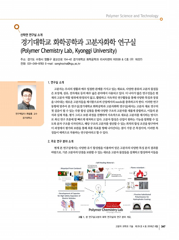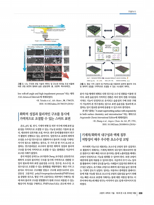 고분자 과학과 기술 제 29 권 4 호 2018년 8월 339 그림 3. 형상 기억 고분자 및 PNIPAAm을 이용하여 표면의 물리적 구조 및 화학적 성질을 가역적으로 조절할 수 있는 시스템의 개략도. 그림 2. 나노 구조화 코팅 기술의 개략도 및 규소와 티타늄 조성 비율에 따른 코팅 표면의 형태와 습윤 성질 왼쪽물, 오른쪽헥사데케인 low roll-off angle and high impalement pressure”라는 제목 으로 Advanced Materials에 게재되었다. H. Teisala et al., Adv. Mater., 30, 1706529, DOI10.1002/adma.201706529 2018 화학적 성질과 물리적인 구조를동시에 가역적으로 조절할 수 있는 스마트표면 온도, pH, 빛, 전기, 기계적 변형 등 외부 자극에 의해 표면 습 윤성을 가역적으로 조절할 수 있는 기능성 표면은 기름과 물 분 리, 세포와의 상호작용 조절, 바이오 센서 등에 활용되면서 연구 가 활발히 진행되고 있는 분야이...