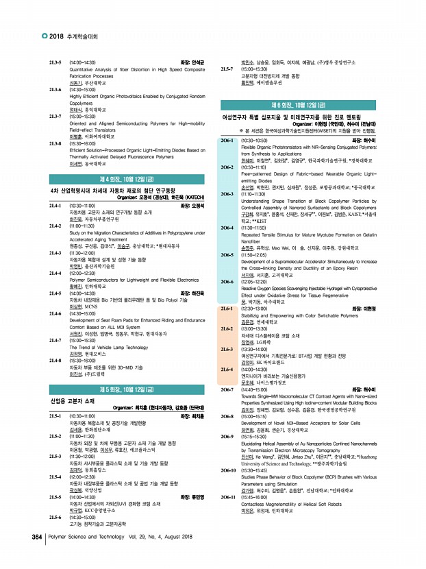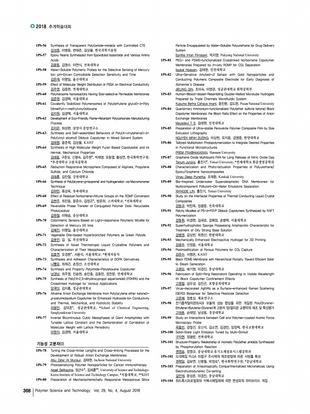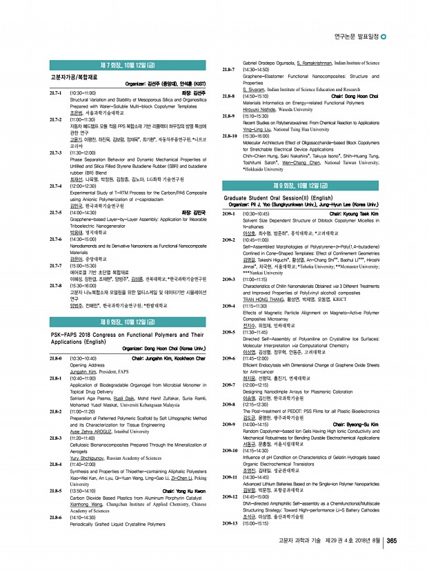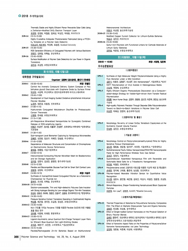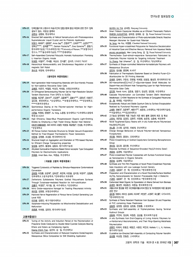 연구논문 발표일정 고분자 과학과 기술 제 29 권 4 호 2018년 8월 367 1PS-15 단축압출기의 고형수지 이송구간의 집합고형체 물성 측정에 관한 연구압축 겉보기 밀도, 이방성 응력비 김현상, 김명호, 한남대학교 1PS-16 Directed Self-assembly of Helical Nanostructure with Photoresponsive Supramolecular Liquid Crystal and Its Photonic Application 박원기, 하태우*, 김튼튼*, Anna Zep**, 안형주***, 신태주****, 심경익*****, 정택선*****, 김재훈*****, Damian Pociecha**, Ewa Gorecka**, 윤동기, 한국과학기술원; *기초과학연구원; **University of Warsaw; ***포항가속기 연구소; ****울산과학기술원; *****연세대학교 1PS-17 Self-Assembled Contorted Polycyclic Aromatic HydrocarbonPromising Li Insertion Organic Anode 박재현, 이철우*, 주세훈, 곽상규, 안석훈*, 강석주, UNIST; *KIST 1PS-18 Hierarchical Maneuverability and Simultaneous Regulation of Multimagnetic Soft Robot 원...