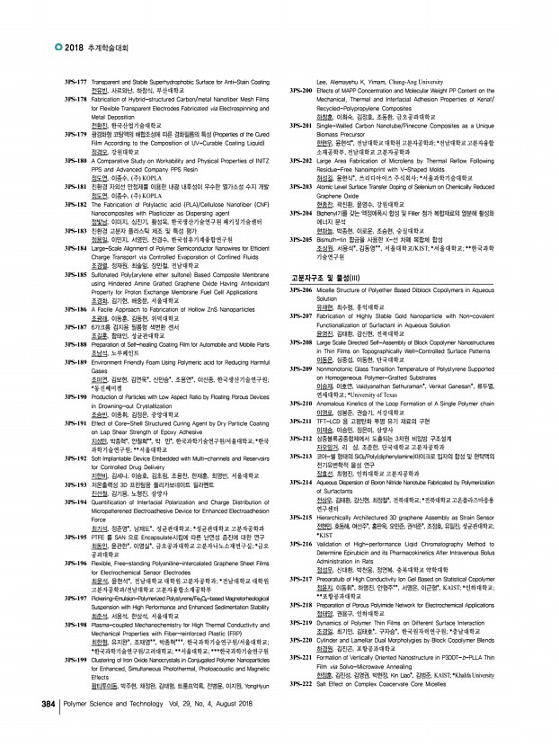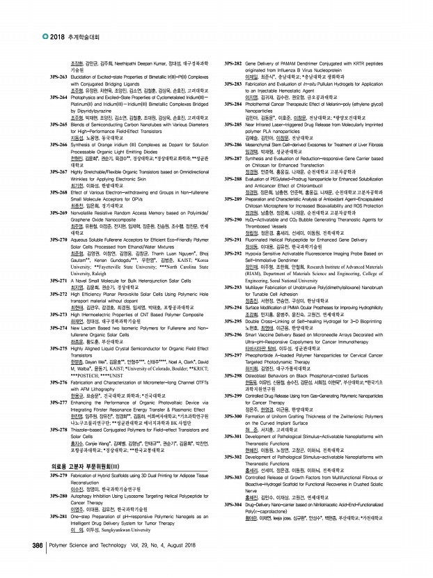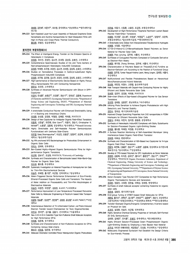 2018 추계학술대회 386 Polymer Science and Technology Vol. 29, No. 4, August 2018 조장환, 강민균, 김주희, Neethipathi Deepan Kumar, 정대성, 대구경북과학 기술원 3PS-263 Elucidation of Excited-state Properties of Bimetallic Ir III -Pt II Complexes with Conjugated Bridging Ligands 조주형, 유정완, 차현욱, 조양진, 김소연, 김철훈, 강상욱, 손호진, 고려대학교 3PS-264 Photophysics and Excited-State Properties of Cyclometalated Iridium III − Platinum II and Iridium III −Iridium III Bimetallic Complexes Bridged by Dipyridylpyrazine 조주형, 박재현, 조양진, 김소연, 김철훈, 조대원, 강상욱, 손호진, 고려대학교 3PS-265 Blends of Semiconducting Carbon Nanotubes with Various Diameters for High-Performance Field‐Effect Transistors 지동섭, 노용영, 동국대학교 3PS-266 Synthesis of Orange iridium III Complexes as Dopant for Solution Processable Organic Light Emitting Diodes 천형진, 김윤희*, 권순기, ...