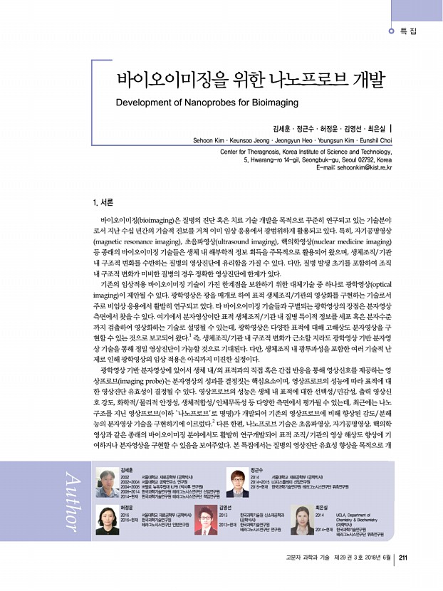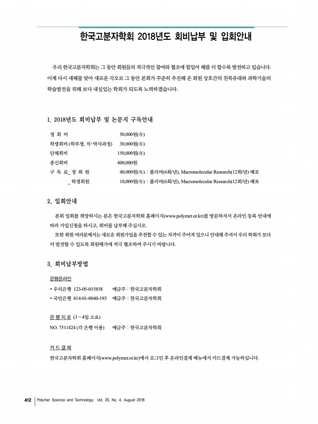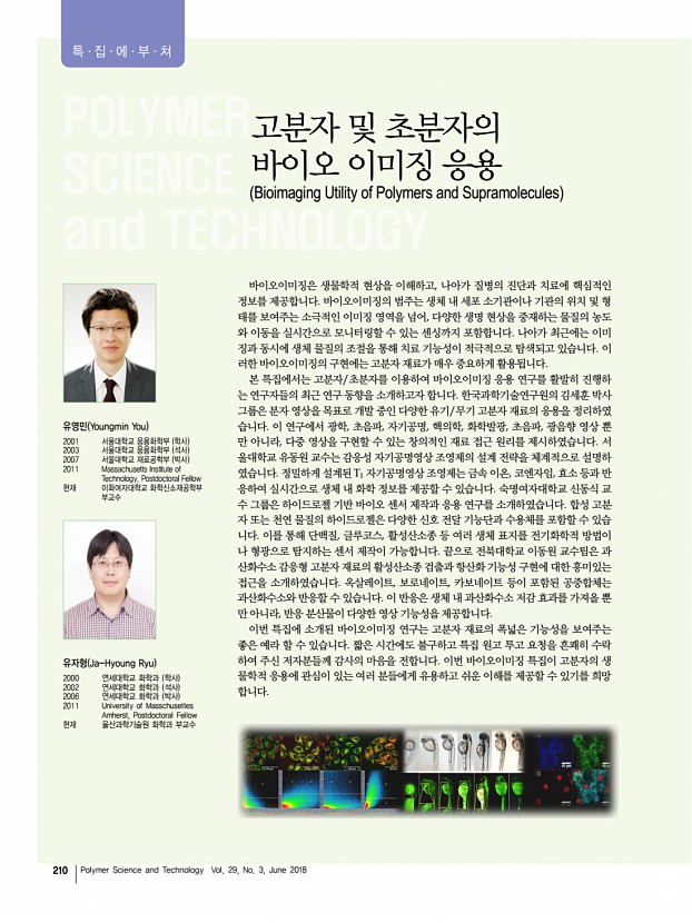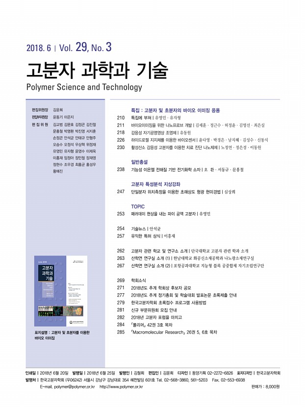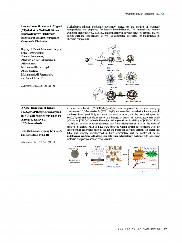 「Macromolecular Research」 목차 고분자 과학과 기술 제 29 권 4 호 2018년 8월 411 Laccase Immobilization onto Magnetic β-Cyclodextrin-Modified ChitosanImproved Enzyme Stability and Efficient Performance for Phenolic Compounds Elimination Roghayeh Tarasi, Masoumeh Alipour, Lena Gorgannezhad, Somaye Imanparast, Aliakbar Yousefi-Ahmadipour, Ali Ramezani, Mohammad Reza Ganjali, Abbas Shafiee, Mohammad Ali Faramarzi*, and Mehdi Khoobi* Macromol. Res., 26, 755 2018 Cyclodextrin-chitosan conjugate covalently coated on the surface of magnetic nanoparticles was employed for laccase immobilization. The immobilized enzyme exhibited higher activity, stability, and reusability at a wide range of thermal and pH values than the free enzyme as well as acceptable efficiency for bio-removal of phenolic compounds. A Novel Framework of Ternary Fe3O4@γ-APTES@rGO Nanohybrid by [CH3OH]-Soluble Distribution for Synergistic Removal of 1,2,3-Benzotriazole Tran Dinh Minh, Byeong-Kyu Lee*, and N...